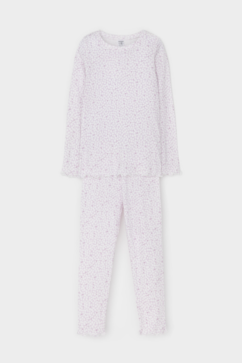Трикотажная пижама в рубчик из натурального хлопка. Джемпер с длинными втачными рукавами и лосины с эластичной резинкой в поясе. Оригинальная набивка выполнена из стойких текстильных гипоаллергенных красителей. Изделие сохраняет цвет и форму после многократных стирок. Все трикотажные полотна производятся в соответсвии с нормами швейцарского сертификата ЭкоТекс.