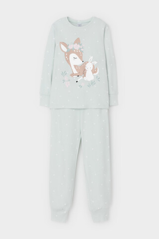 Трикотажная пижама из натурального хлопка. Джемпер с длинными втачными рукавами и брюки с эластичной резинкой в поясе. Мягкие манжеты на рукавах и по низу брюк. Оригинальная набивка и принт выполнены из стойких текстильных гипоаллергенных красителей. Изделие сохраняет цвет и форму после многократных стирок. Все трикотажные полотна производятся в соответствии с нормами швейцарского сертификата ЭкоТекс.