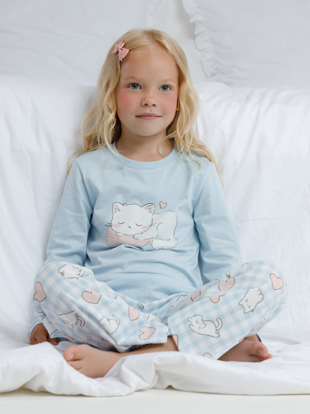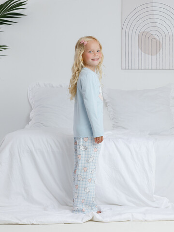 Пижама для девочки из натурального хлопка. Джемпер с длинными втачными рукавами и прямые брюки с эластичной резинкой в поясе. Оригинальная набивка и принт выполнены из стойких текстильных гипоаллергенных красителей. Изделие сохраняет цвет и форму после многократных стирок. Все трикотажные полотна производятся в соответствии с нормами швейцарского сертификата ЭкоТекс.