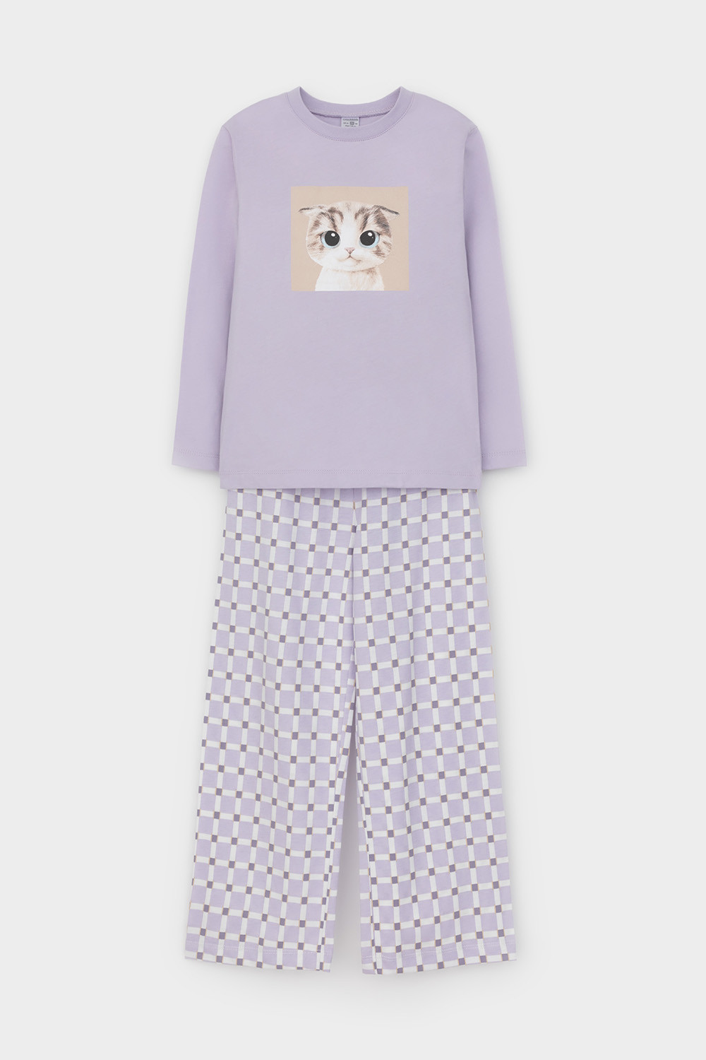 Пижама для девочки из натурального хлопка. Джемпер с длинными втачными рукавами и прямые брюки с эластичной резинкой в поясе. Оригинальная набивка и принт выполнены из стойких текстильных гипоаллергенных красителей. Изделие сохраняет цвет и форму после многократных стирок. Все трикотажные полотна производятся в соответствии с нормами швейцарского сертификата ЭкоТекс.