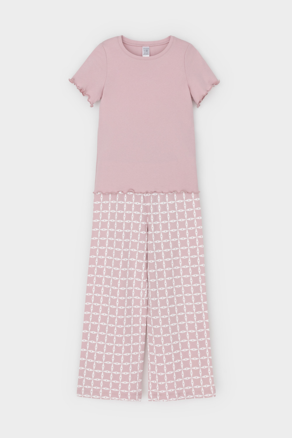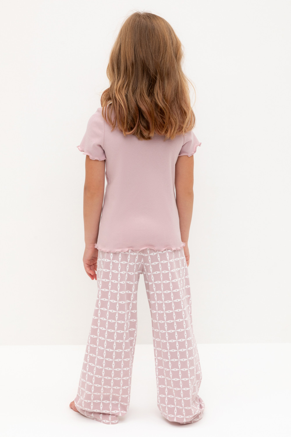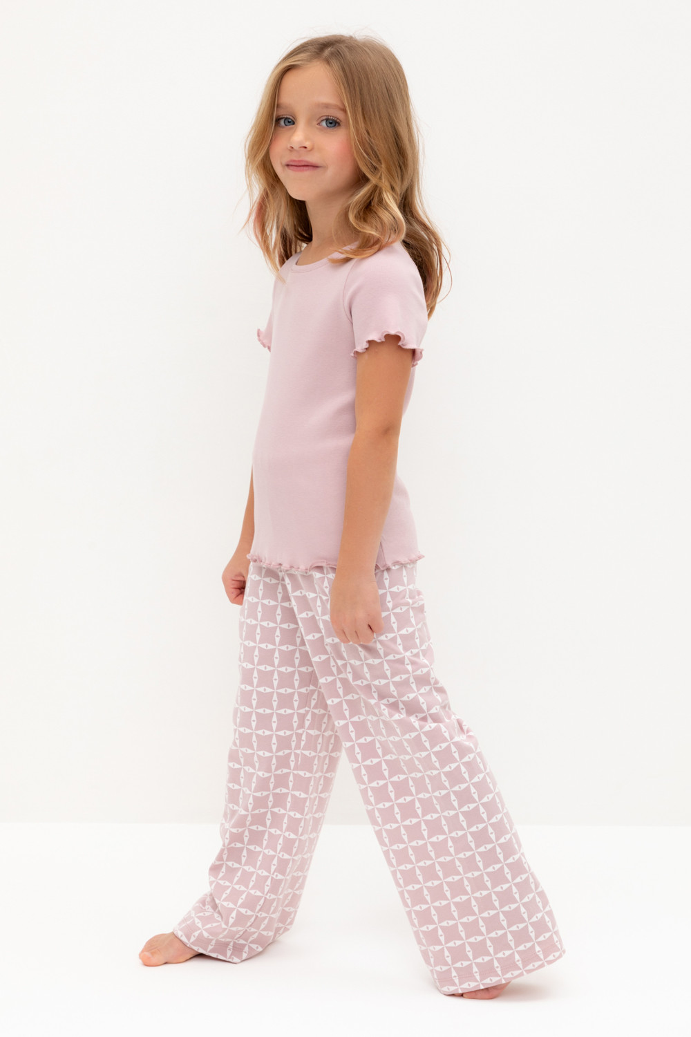 Трикотажная пижама из натурального хлопка. Футболка с короткими втачными рукавами изготовлена из эластичного трикотажа в рубчик. Брюки с эластичной резинкой в поясе выполнены из гладкого трикотажа супрем. Оригинальная набивка выполнена из стойких текстильных гипоаллергенных красителей. Изделие сохраняет цвет и форму после многократных стирок. Все трикотажные полотна производятся в соответсвии с нормами швейцарского сертификата ЭкоТекс.