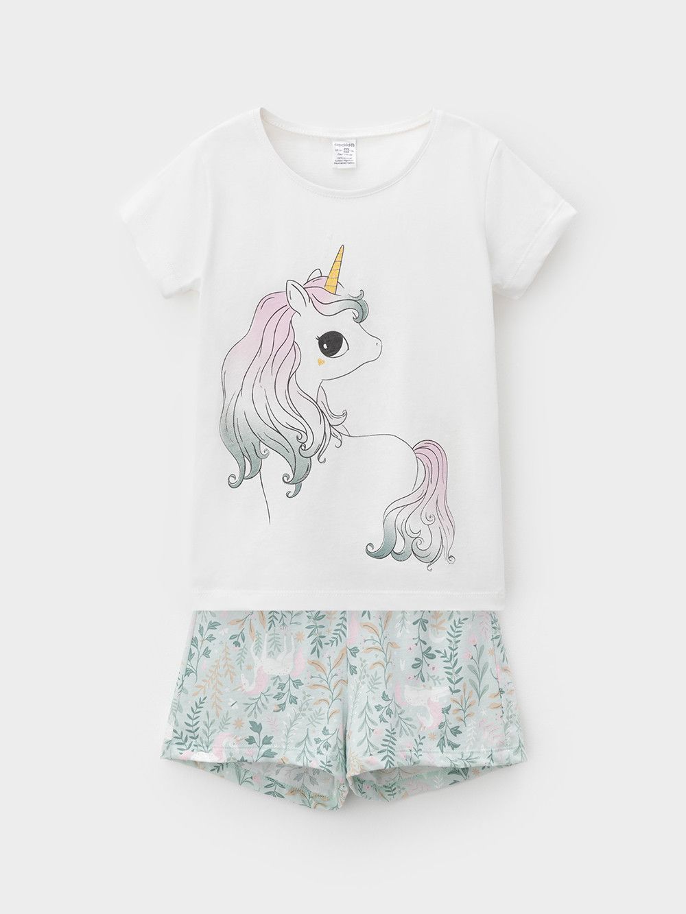 Трикотажная пижама из натурального хлопка. Футболка с принтом и короткими спущенными рукавами. У шорт в комплекте мягкий, эластичный пояс на резинке. Оригинальная набивка выполнена из стойких, гипоаллергенных текстильных красителей. Комплект сохраняет цвет и форму после многократных стирок. Все трикотажные полотна производятся в соответсвии с нормами Швейцарского сертификата ЭкоТекс.