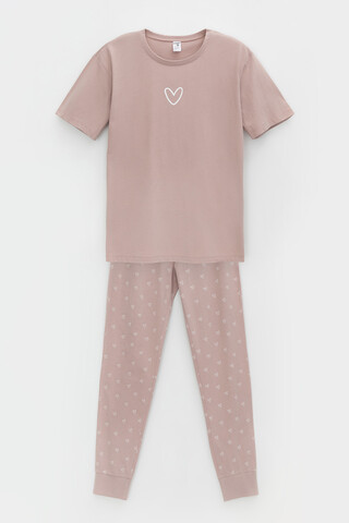 Трикотажный пижамный комплект из натурального хлопка. У футболки короткие рукава со спущенными плечами. Брюки с удобным поясом на резинке и эластичными манжетами. Оригинальная набивка и принт выполнены из стойких, гипоаллергенных текстильных красителей. Все трикотажные полотна производятся в соответствии с нормами Швейцарского сертификата ЭкоТекс.