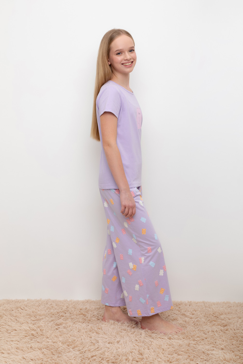 Трикотажный пижамный комплект из натурального хлопка. В комплекте футболка с короткими рукавами и со спущенными плечами. Укороченные брюки с удобным поясом на резинке. Оригинальная набивка и принт выполнены из стойких, гипоаллергенных текстильных красителей. Все трикотажные полотна производятся в соответствии с нормами Швейцарского сертификата ЭкоТекс.