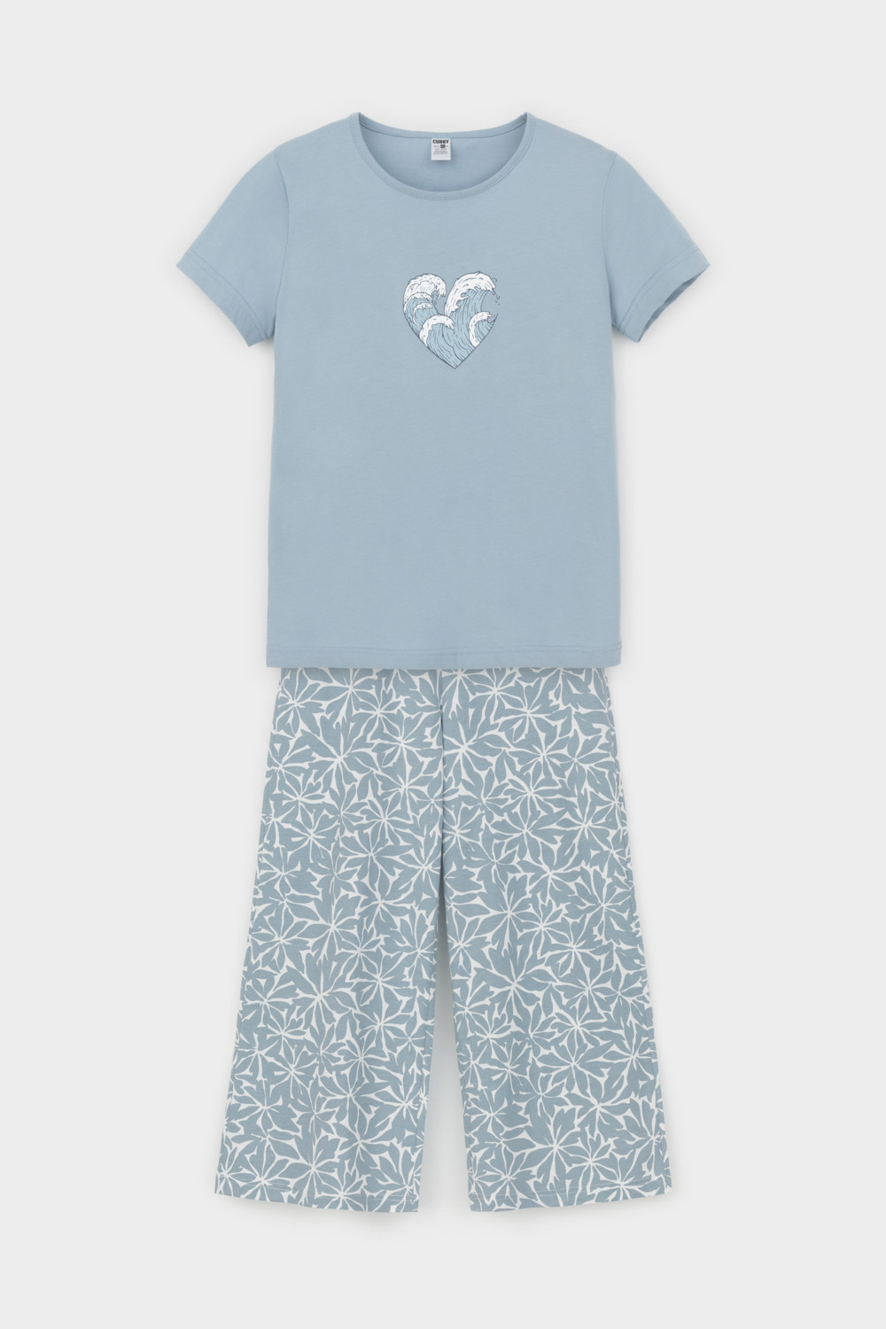 Трикотажный пижамный комплект из натурального хлопка. В комплекте футболка с короткими рукавами и со спущенными плечами. Укороченные брюки с удобным поясом на резинке. Оригинальная набивка и принт выполнены из стойких, гипоаллергенных текстильных красителей. Все трикотажные полотна производятся в соответствии с нормами Швейцарского сертификата ЭкоТекс.