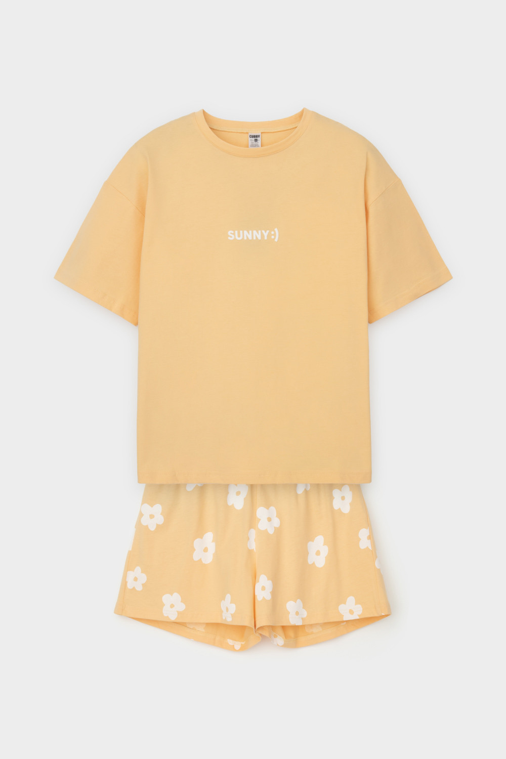 Трикотажный пижамный комплект из натурального хлопка. У футболки короткие рукава со спущенными плечами. Шорты с поясом на резинке. Оригинальная набивка выполнена из стойких, гипоаллергенных текстильных красителей. Все трикотажные полотна производятся в соответствии с нормами Швейцарского сертификата ЭкоТекс.