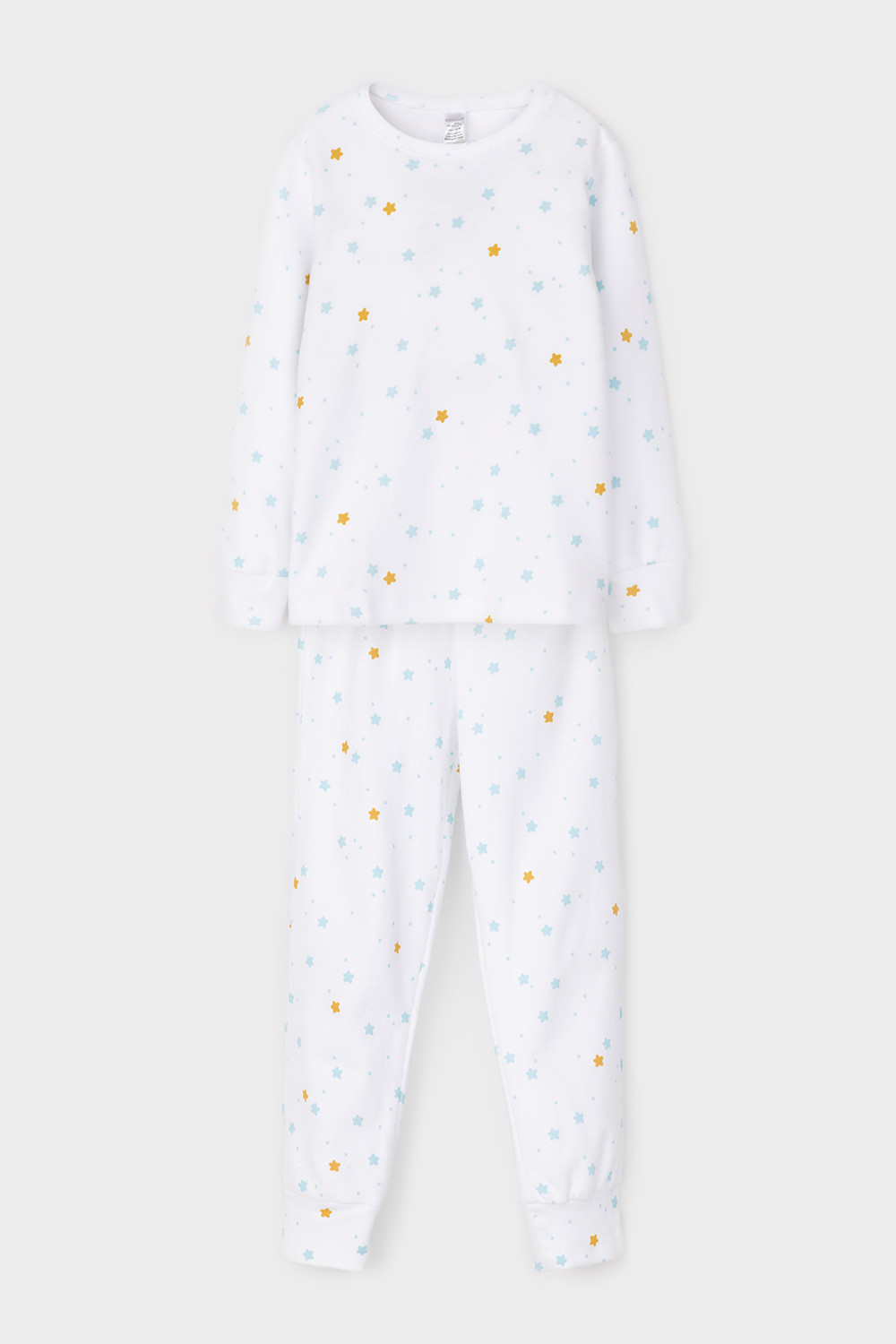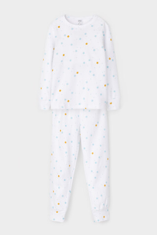 Трикотажный пижамный комплект из натурального хлопка. У джемпера длинные втачные рукава с мягкими манжетами. Брюки с удобным поясом на резинке и эластичными манжетами. Оригинальная набивка выполнена из стойких, гипоаллергенных текстильных красителей. Все трикотажные полотна производятся в соответствии с нормами Швейцарского сертификата ЭкоТекс.