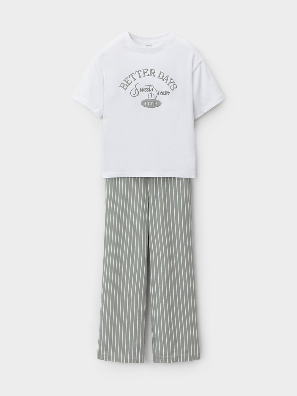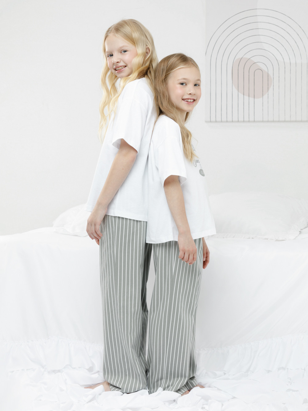 Трикотажная пижама из натурального хлопка для комфортного сна и отдыха. Свободная футболка с короткими рукавами и прямые брюки с мягкой эластичной резинкой в поясе. Оригинальный принт и набивка выполнены из стойких текстильных гипоаллергенных красителей. Изделие сохраняет цвет и форму после многократных стирок. Все трикотажные полотна производятся в соответствии с нормами швейцарского сертификата ЭкоТекс.