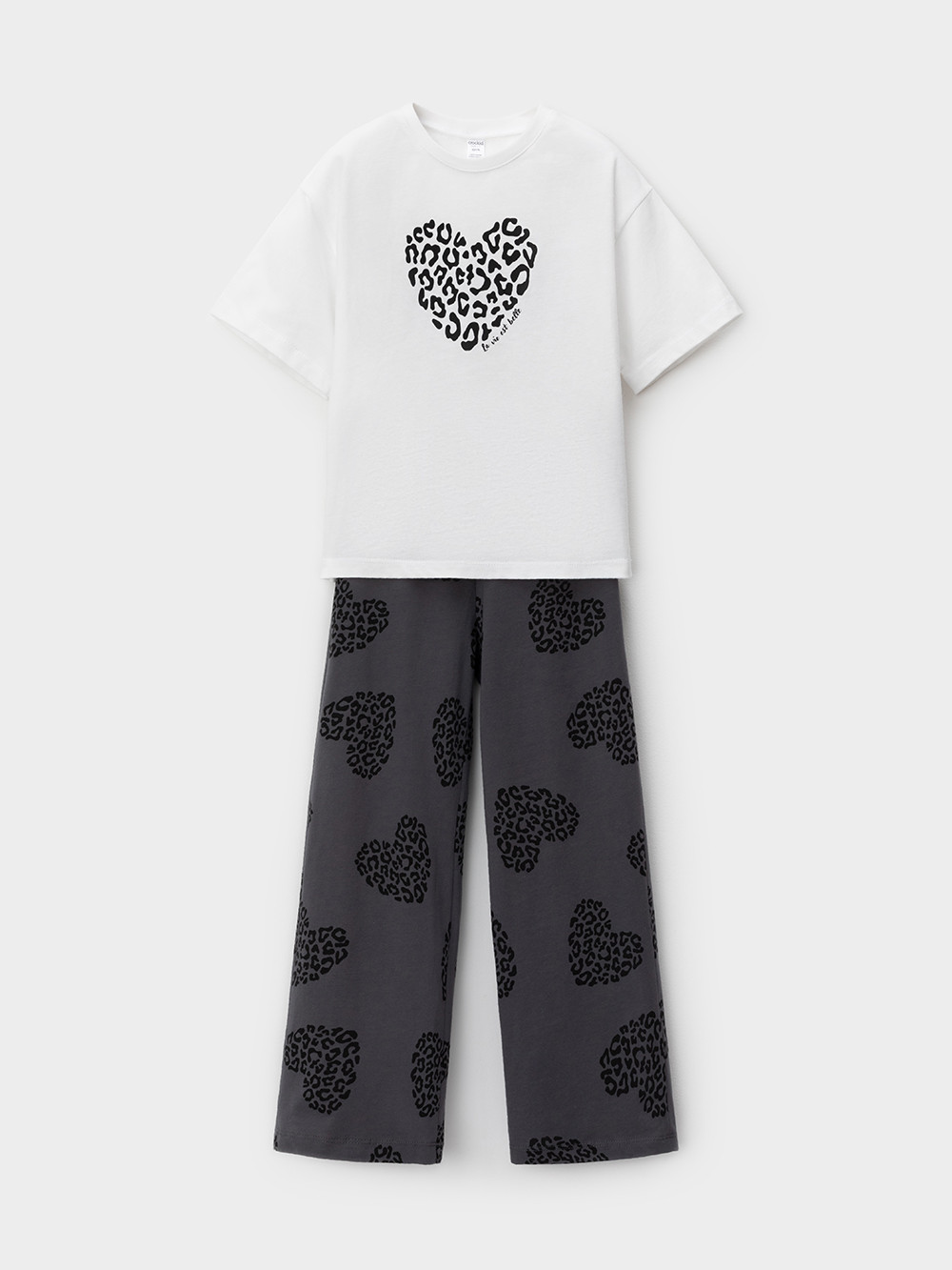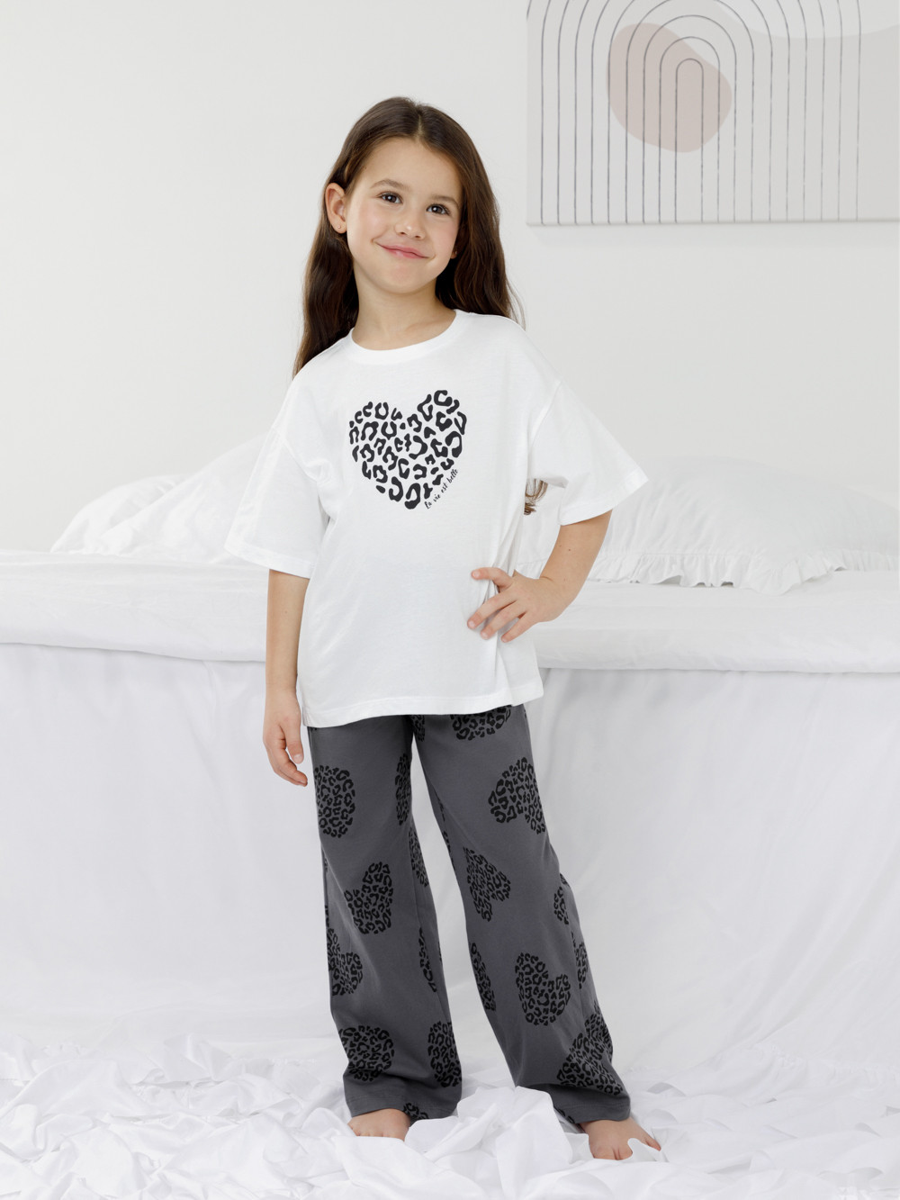 Трикотажная пижама из натурального хлопка для комфортного сна и отдыха. Свободная футболка с короткими рукавами и прямые брюки с мягкой эластичной резинкой в поясе. Оригинальный принт и набивка выполнены из стойких текстильных гипоаллергенных красителей. Изделие сохраняет цвет и форму после многократных стирок. Все трикотажные полотна производятся в соответствии с нормами швейцарского сертификата ЭкоТекс.