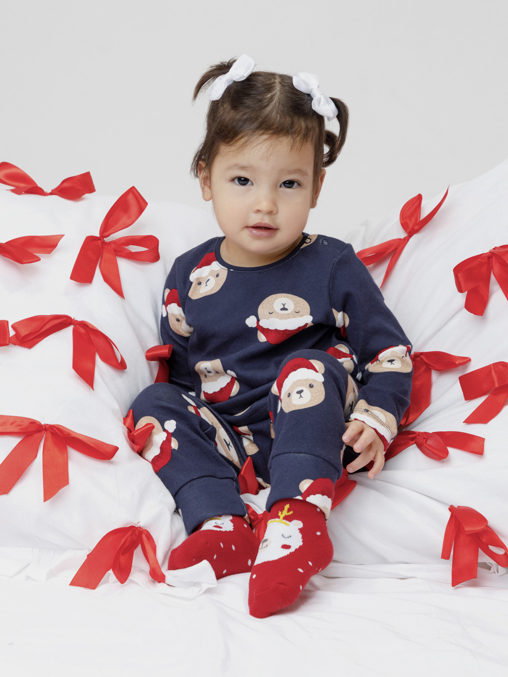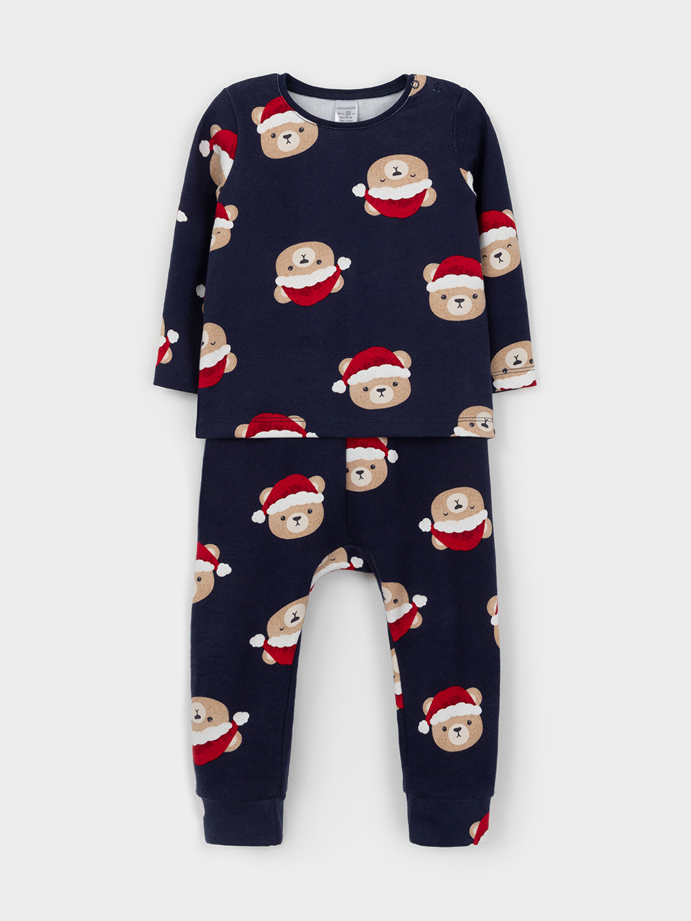 Трикотажная пижама из натурального хлопка. Джемпер с длинными втачными рукавами и брюки с эластичной резинкой в поясе. Отлично подойдёт для создания праздничных образов или в качестве подарка малышу на Новый год и Рождество. Джемпер застёгивается на кнопки. По низу брюк мягкие манжеты. Оригинальная набивка выполнена из стойких текстильных гипоаллергенных красителей. Изделие сохраняет цвет и форму после многократных стирок. Все трикотажные полотна производятся в соответствии с нормами швейцарского сертификата ЭкоТекс.