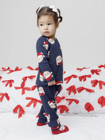 Трикотажная пижама из натурального хлопка. Джемпер с длинными втачными рукавами и брюки с эластичной резинкой в поясе. Отлично подойдёт для создания праздничных образов или в качестве подарка малышу на Новый год и Рождество. Джемпер застёгивается на кнопки. По низу брюк мягкие манжеты. Оригинальная набивка выполнена из стойких текстильных гипоаллергенных красителей. Изделие сохраняет цвет и форму после многократных стирок. Все трикотажные полотна производятся в соответствии с нормами швейцарского сертификата ЭкоТекс.