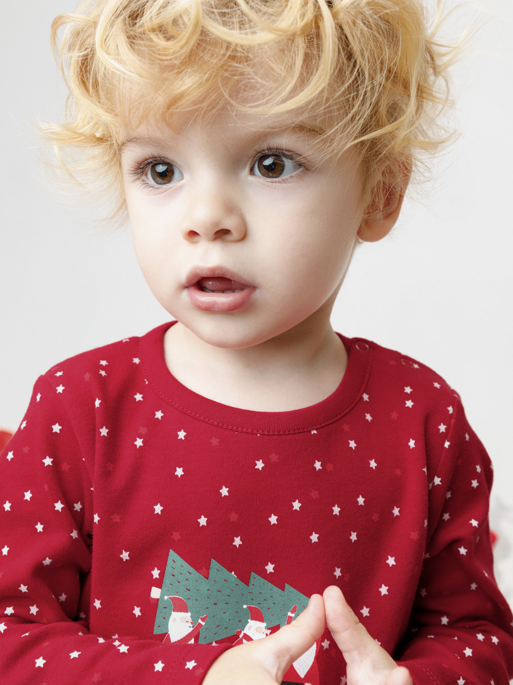Трикотажная пижама из натурального хлопка. Джемпер с длинными втачными рукавами и брюки с эластичной резинкой в поясе. Отлично подойдёт для создания праздничных образов или в качестве подарка малышу на Новый год и Рождество. Джемпер застёгивается на кнопки. По низу брюк мягкие манжеты. Оригинальная набивка и принт выполнены из стойких текстильных гипоаллергенных красителей. Изделие сохраняет цвет и форму после многократных стирок. Все трикотажные полотна производятся в соответствии с нормами швейцарского сертификата ЭкоТекс.