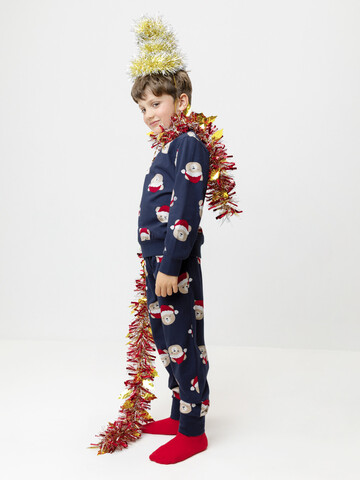 Новогодняя пижама из натурального хлопка. Джемпер с длинными втачными рукавами и брюки с эластичной резинкой в поясе. Мягкие манжеты на рукавах и по низу брюк. Пижама отлично подойдёт для создания уютных домашних образов или в качестве подарка на Новый год и Рождество. Оригинальная набивка выполнена из стойких текстильных гипоаллергенных красителей. Изделие сохраняет цвет и форму после многократных стирок. Все трикотажные полотна производятся в соответствии с нормами швейцарского сертификата ЭкоТекс.