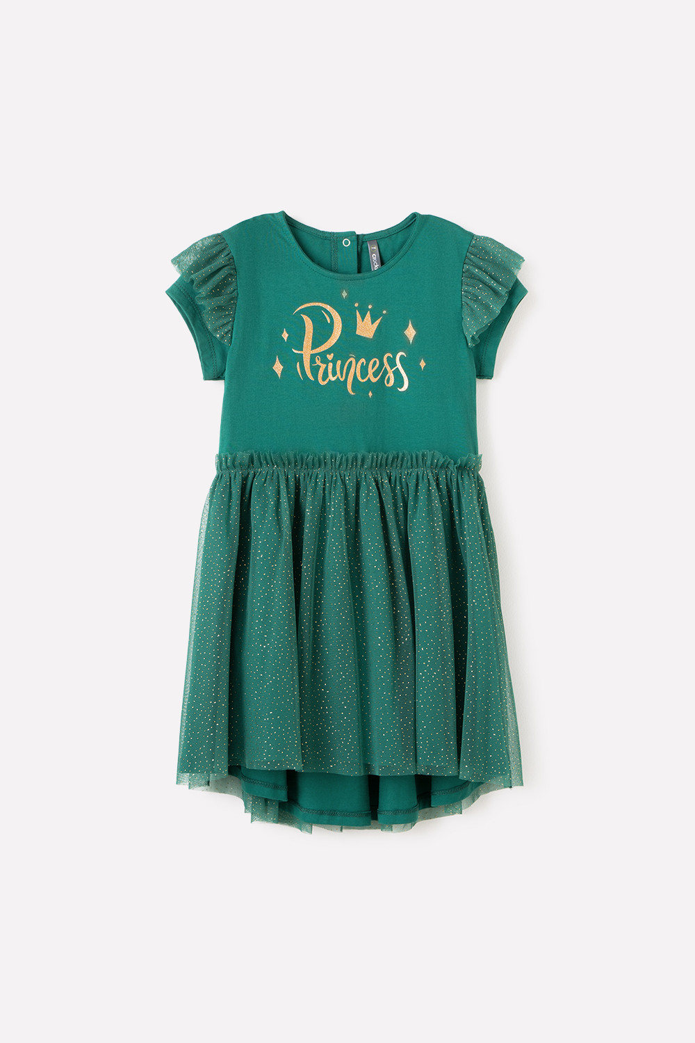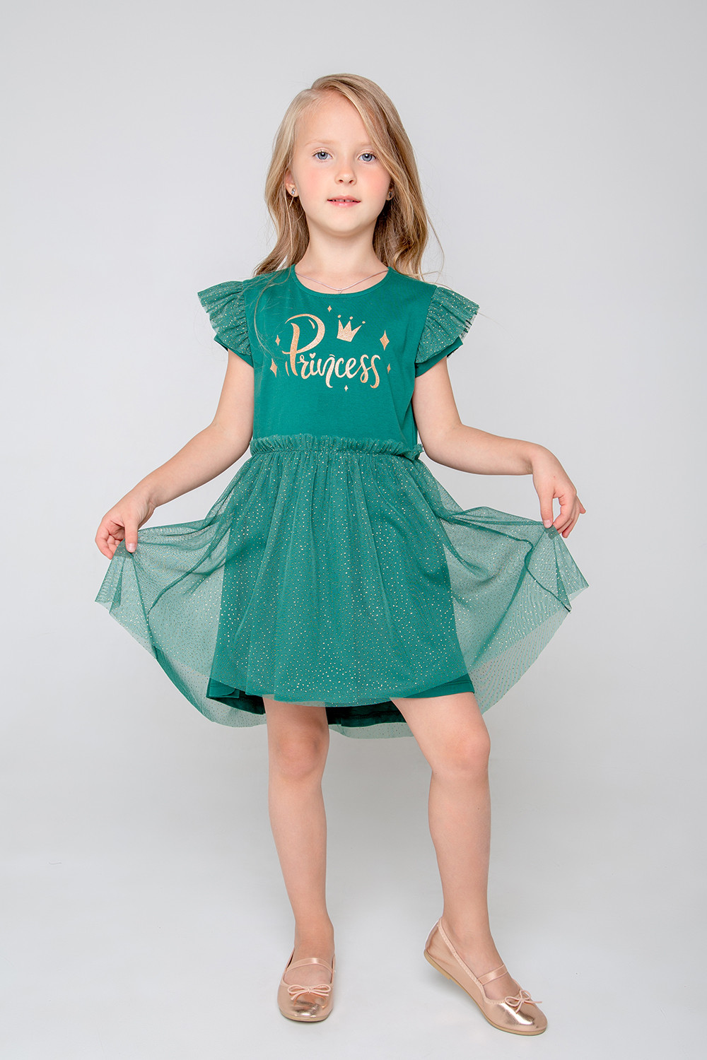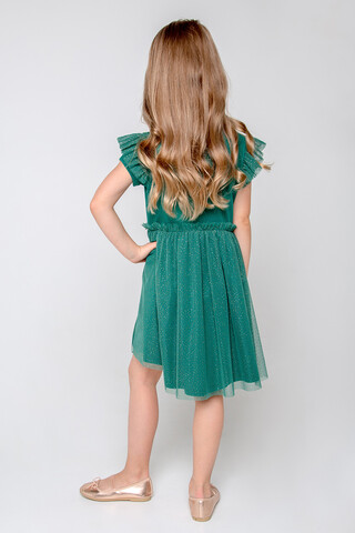 Нарядное тёмно-зелёное платье. Лиф из супрема украшен принтом. Верхний слой юбки сделан из сетки с золотыми блёстками, на талии красивая сборка. На рукавах оборка из сетки. До 98 размера для удобства при одевании застёгивается на спинке с помощью кнопок.