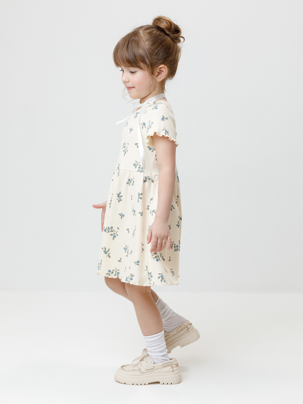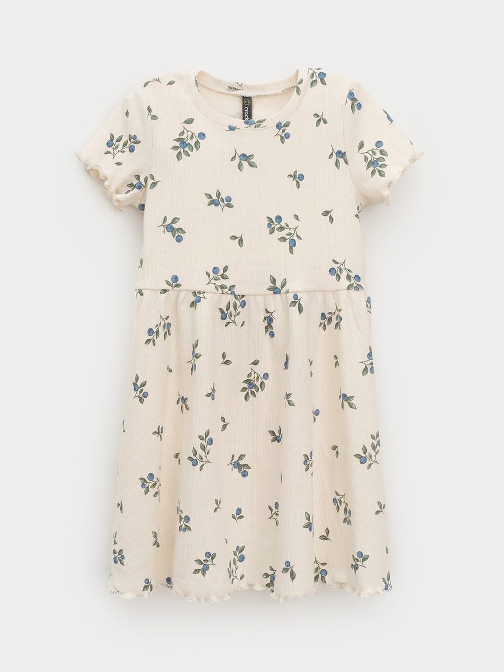 Лёгкое платье для девочки с короткими рукавами из эластичного трикотажа в рубчик. Оригинальная набивка выполнена из стойких текстильных гипоаллергенных красителей. Изделие сохраняет цвет и форму после многократных стирок.