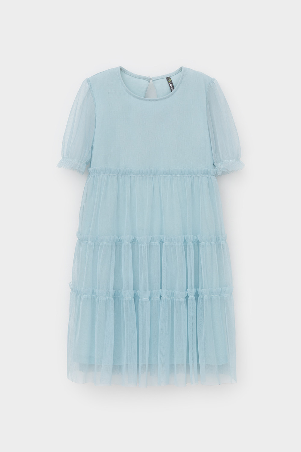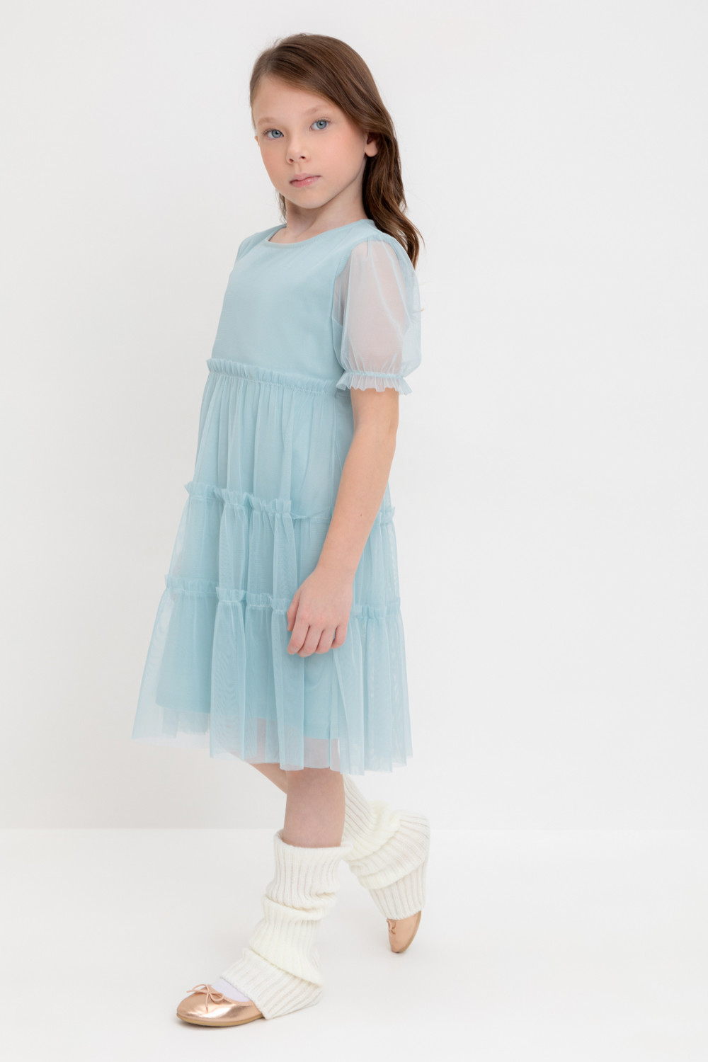 Нарядное платье для девочки из высококачественного трикотажа супрем с лёгким слоем из сетки. Короткие рукава из сетки собраны на резинку. Для удобства одевания платье застёгивается на пуговицу на спинке. Платье сохраняет форму и стойкий цвет после многочисленных стирок и идеально подходит для праздников и фотосессий.