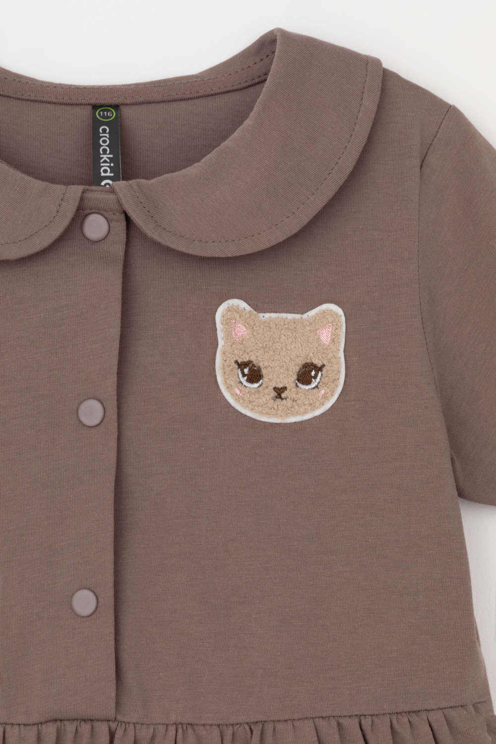 Лёгкое трикотажное платье с воротничком и короткими спущенными рукавами из высококачественного хлопка. Изделие сохраняет цвет и форму после многократных стирок. Застёгивается спереди на кнопки.