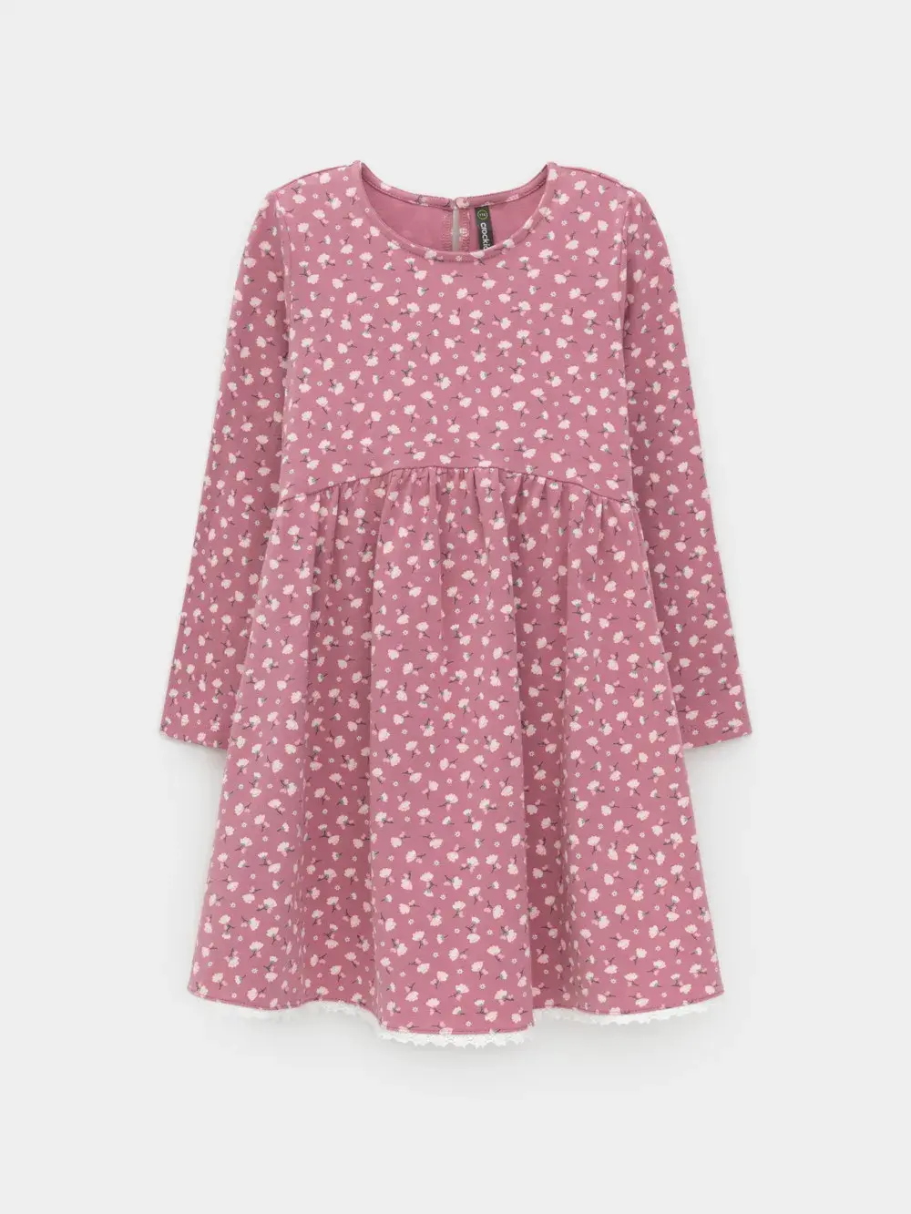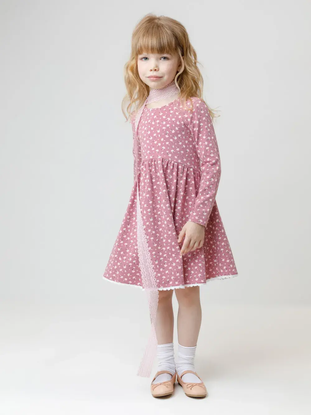 Платье для девочки с длинными рукавами из высококачественного гладкого трикотажа. Для удобства одевания на спинке платье застёгивается на пуговицу. Украшено кружевом. Платье сохраняет форму и стойкий цвет после многочисленных стирок и идеально подходит на каждый день. Все трикотажные полотна производятся в соответствии с нормами швейцарского сертификата ЭкоТекс.