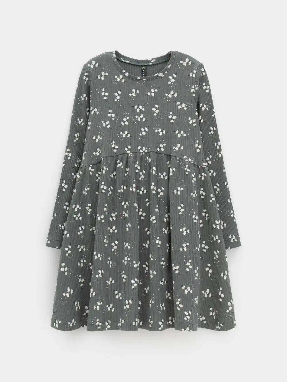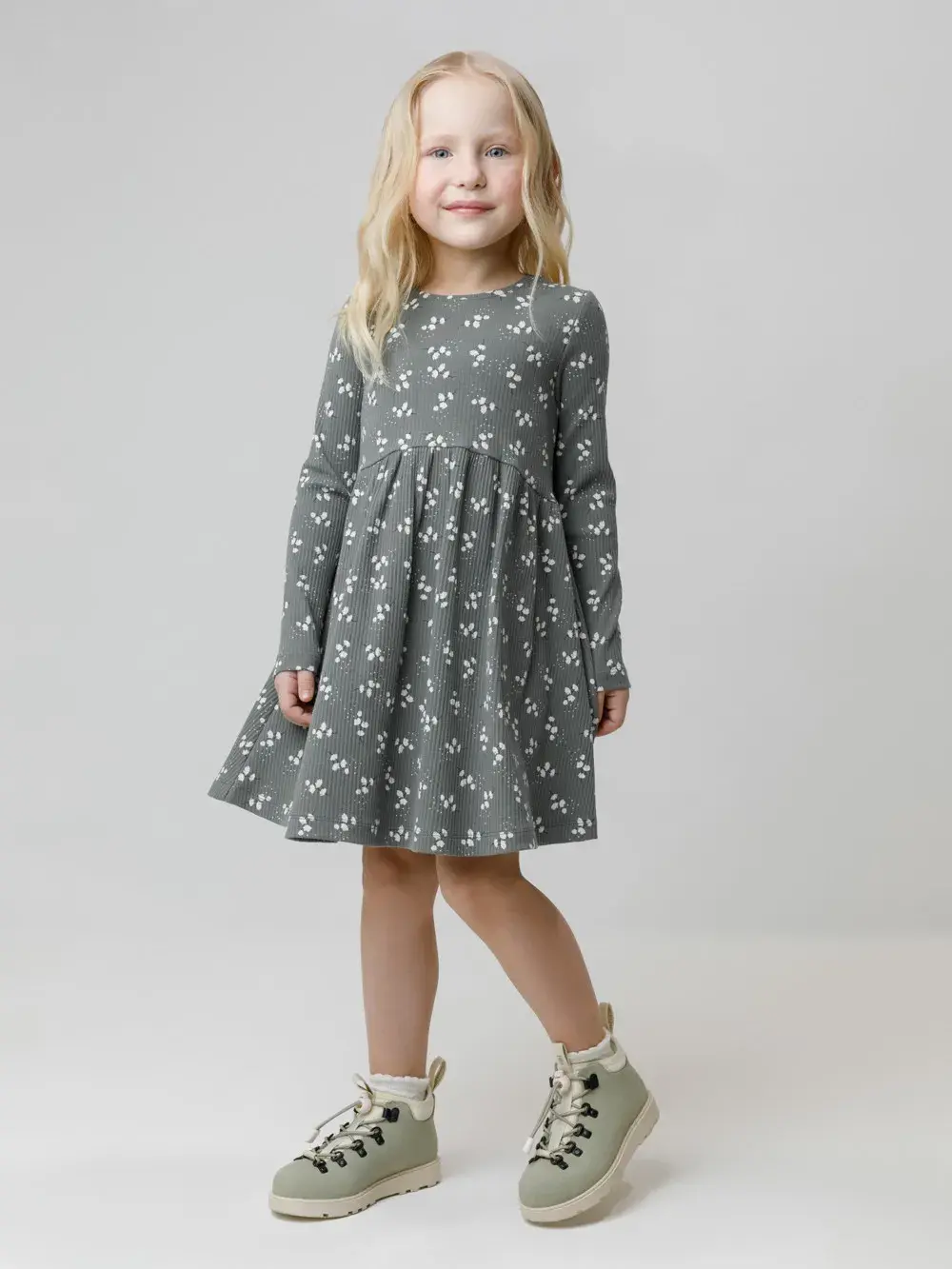 Платье для девочки из эластичного трикотажа в рубчик. Оригинальный рисунок выполнен из стойких текстильных гипоаллергенных красителей. Изделие сохраняет цвет и форму после многократных стирок. Все трикотажные полотна производятся в соответствии с нормами швейцарского сертификата ЭкоТекс.