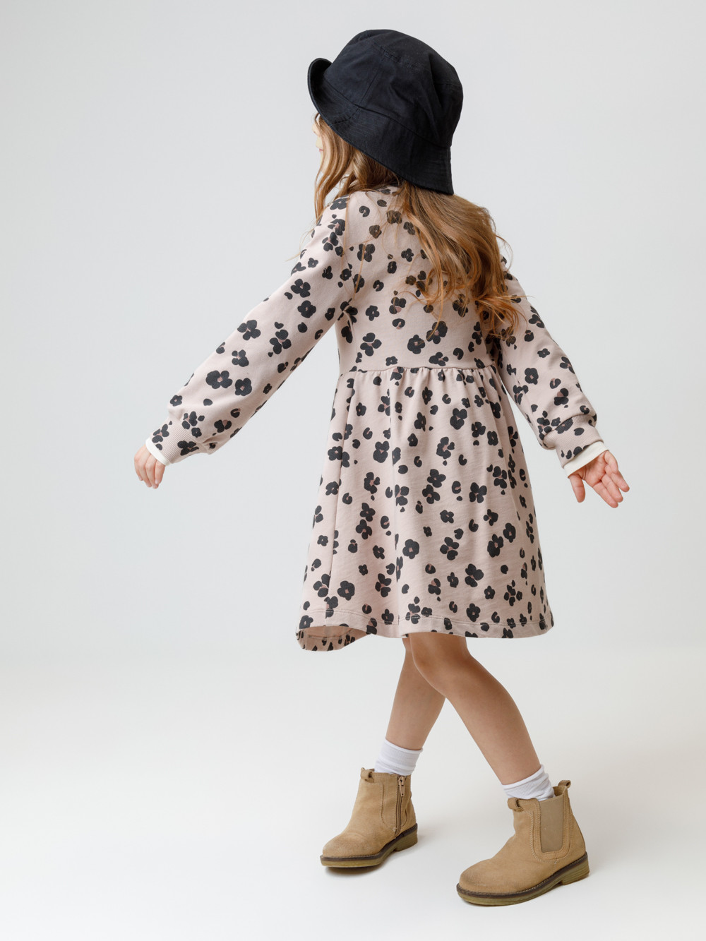 Платье с длинными рукавами для девочки из мягкого петельчатого футера. В размерах 92 и 98 на спине застёгивается на кнопки. Оригинальный рисунок выполнен из стойких текстильных гипоаллергенных красителей. Изделие сохраняет цвет и форму после многократных стирок. Все трикотажные полотна производятся в соответствии с нормами швейцарского сертификата ЭкоТекс.