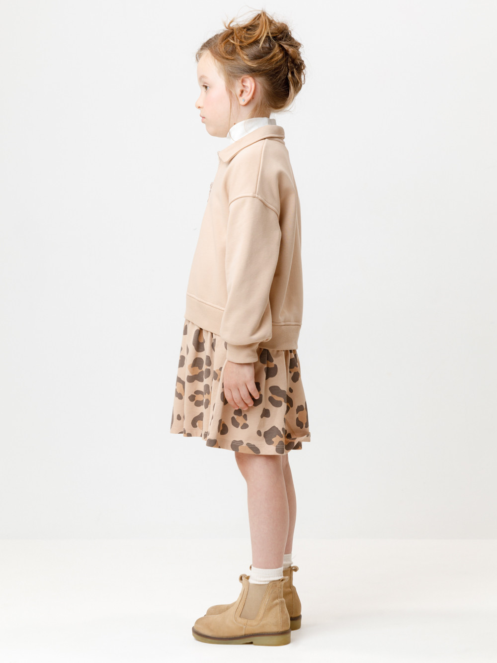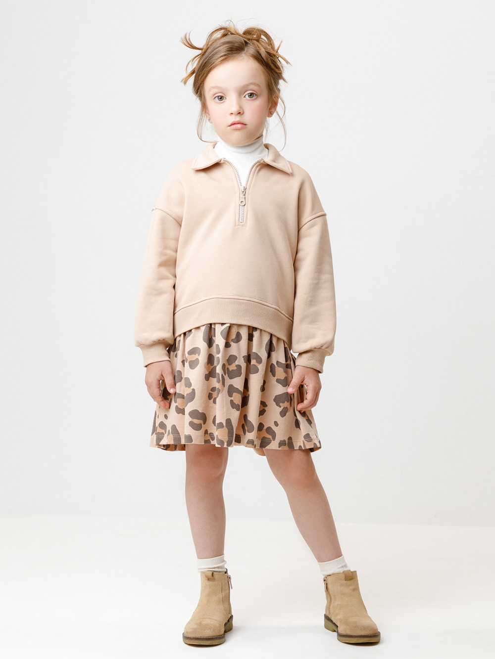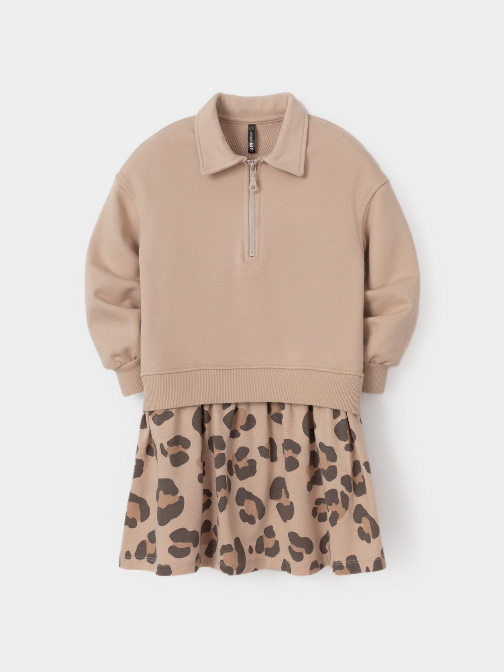 Платье для девочки с длинными рукавами и воротничком. Изготовлено из мягкого петельчатого трикотажа и украшено оборкой из гладкого материала супрем. Спереди застёжка на короткую молнию. Платье сохраняет форму и стойкий цвет после многочисленных стирок и идеально подходит на каждый день. Оригинальный принт выполнен из стойких текстильных гипоаллергенных красителей. Все трикотажные полотна производятся в соответствии с нормами швейцарского сертификата ЭкоТекс.