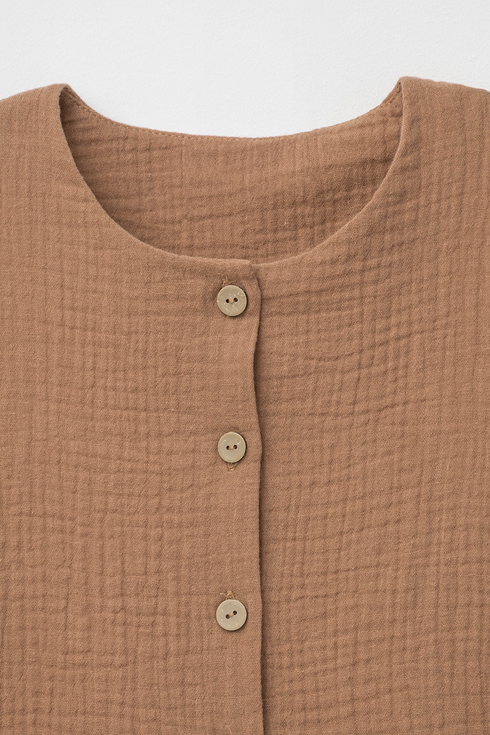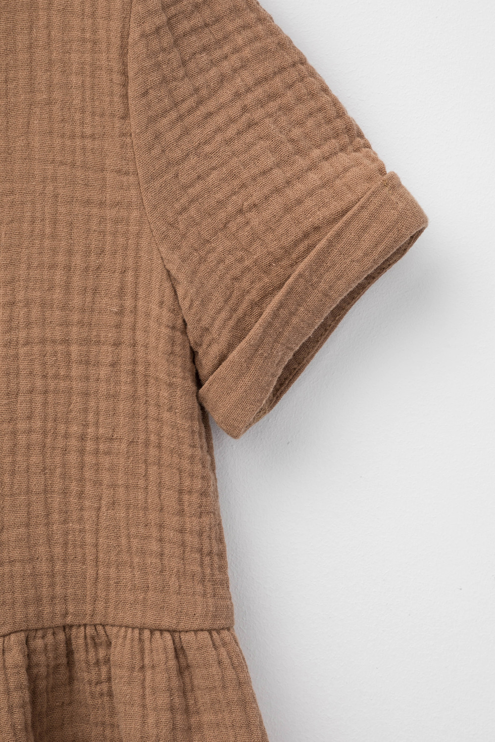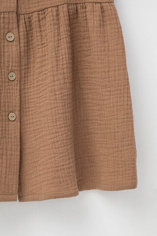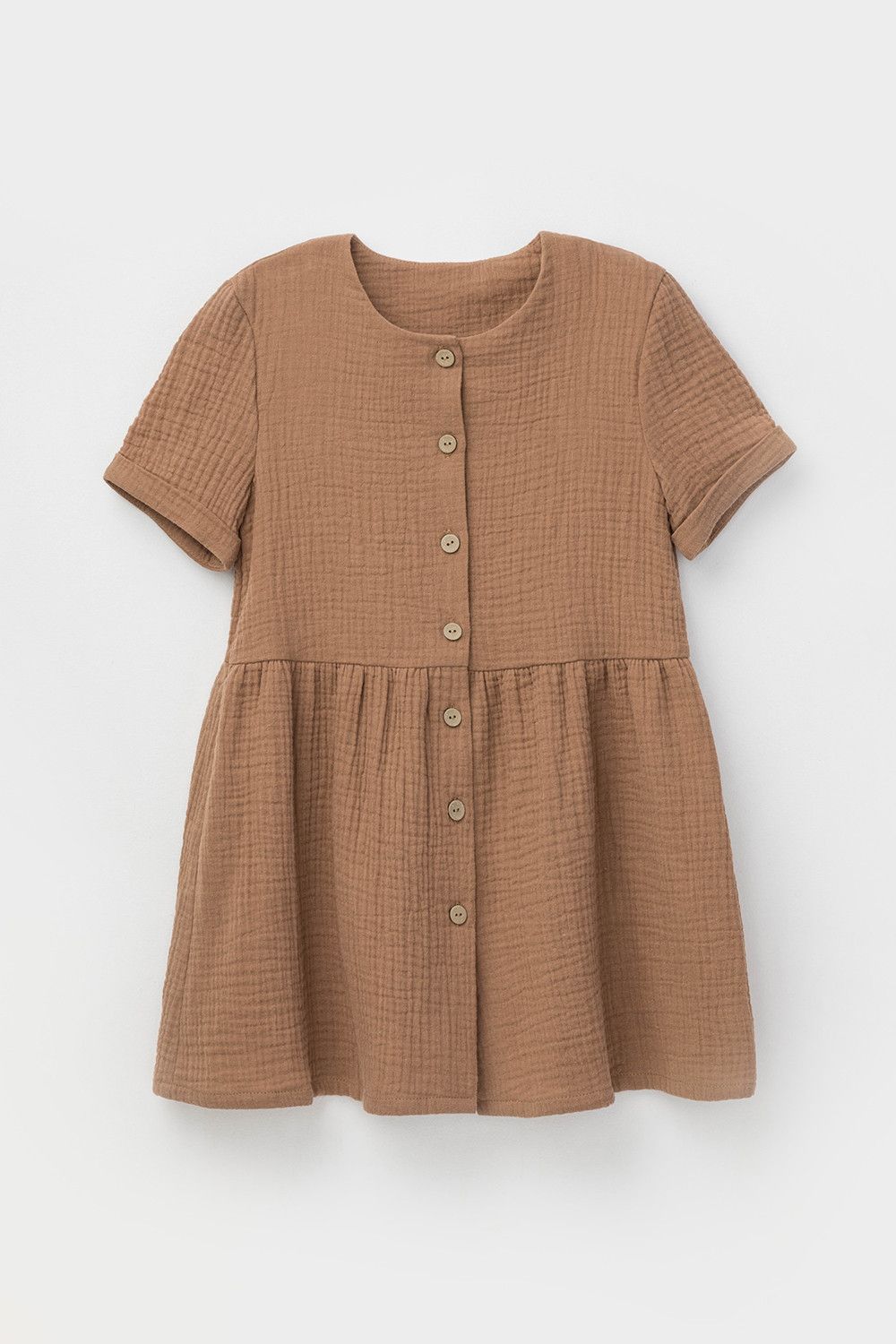 Легкое платье для девочки из мягкого хлопокового муслина со спущенной линией талии, сборкой и застежкой на пуговицы. Изделие сохраняет цвет, форму и фактуру жатости после многократных стирок.