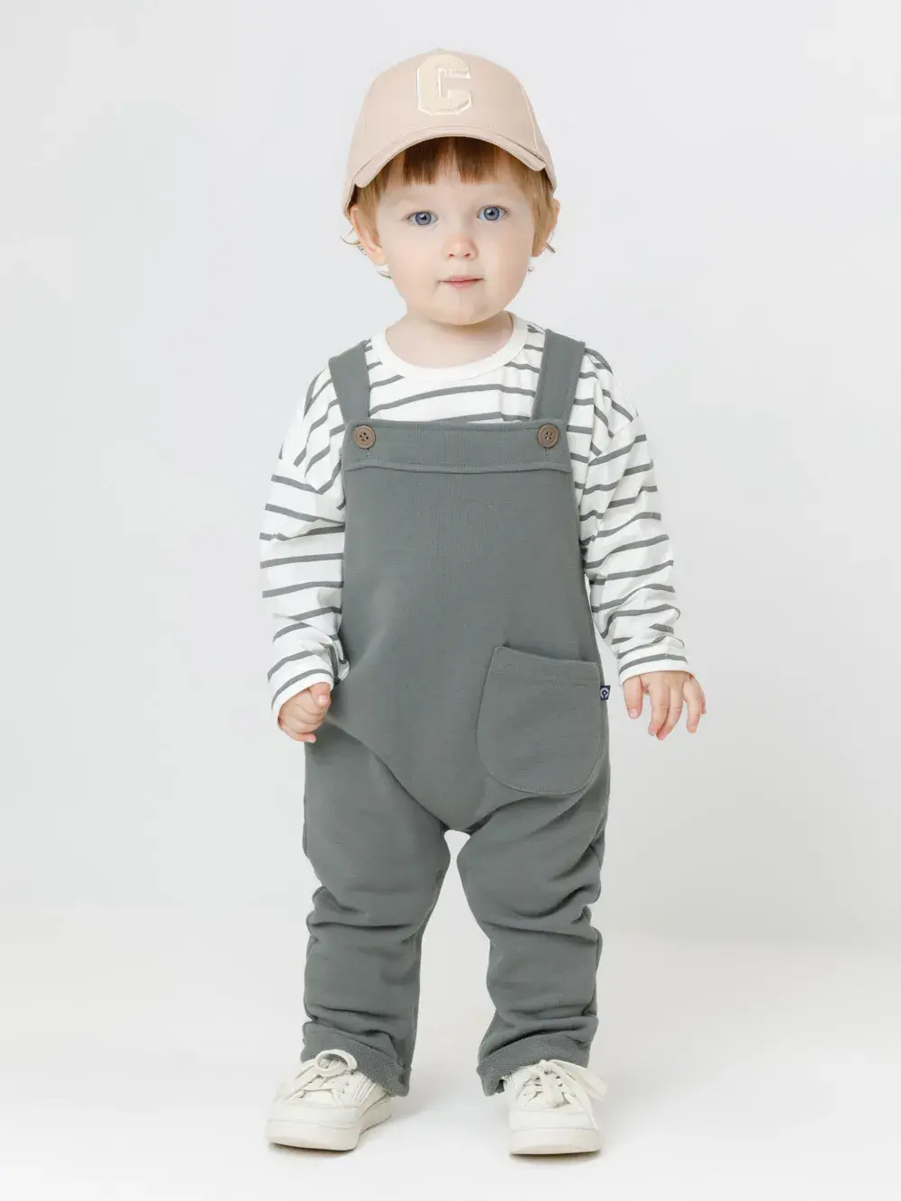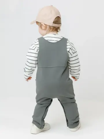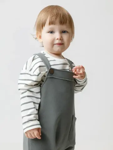 Полукомбинезон для мальчика из мягкого петельчатого футера трёхнитки. В составе 80% натурального хлопка и 20% полиэстера, при этом полиэстер ввязан внутрь по особой технологии и не соприкасается с кожей. Модель с лямками на пуговицах и застёжкой на кнопки по шаговому шву. Низ с отворотами. Изделие сохраняет цвет и форму после многократных стирок. Все трикотажные полотна производятся в соответствии с нормами швейцарского сертификата ЭкоТекс.