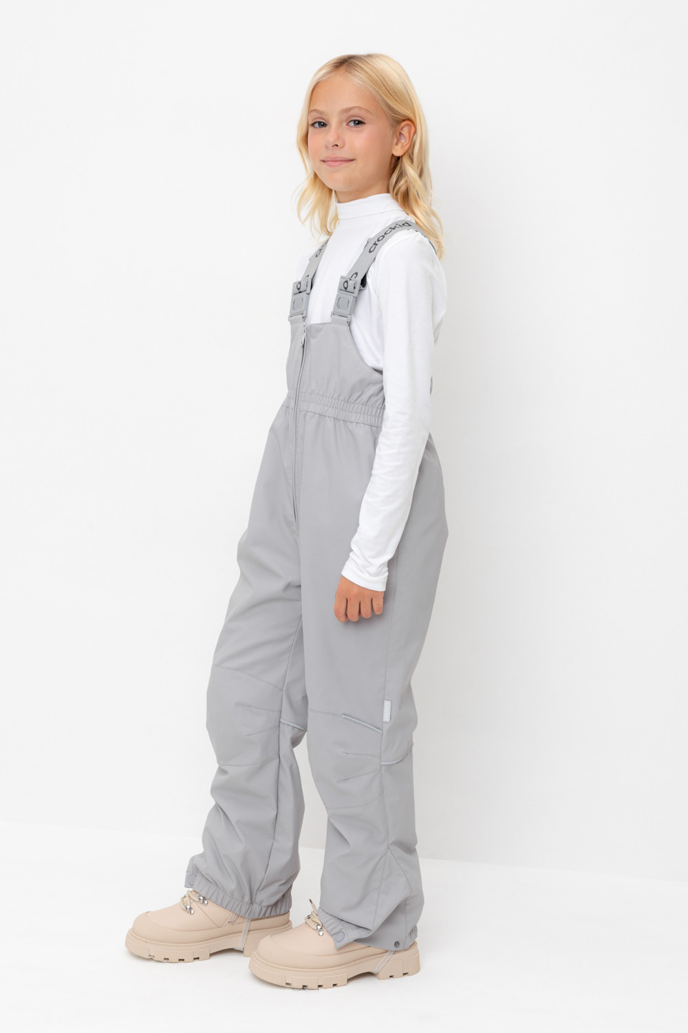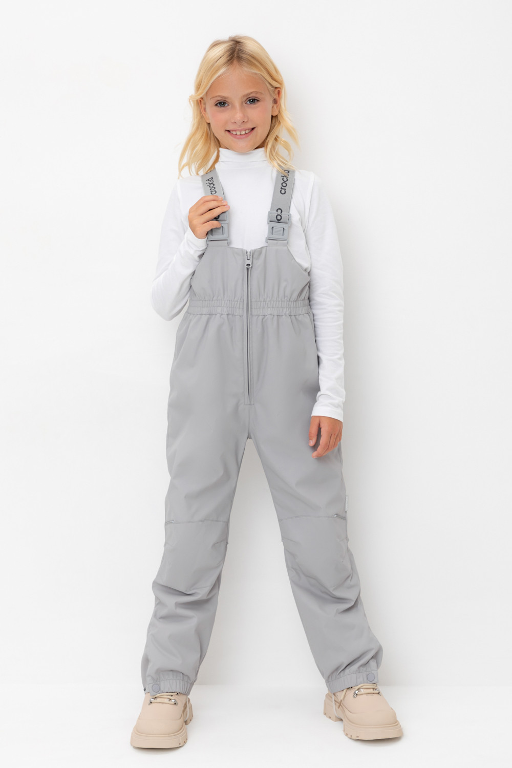 Демисезонный полукомбинезон детский с утеплителем 60г/м2. Выполнен из мембранной ткани с дополнительной тефлоновой обработкой. Данный вид обработки предохраняет изделие от загрязнения и лучше отводит влагу. Подклад из 100% полиэстра. Эластичные лямки для удобства регулируются по длине. Область коленей дополнительно усилена деталями из основной ткани. Низ на резинке, регулируется по ширине при помощи кнопки. Для фиксации полукомбинезона используются съемные силиконовые штрипки. Во всех изделиях верхнего ассортимента для безопасности ребенка предусмотрены светоотражающие элементы.