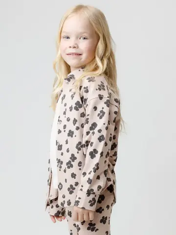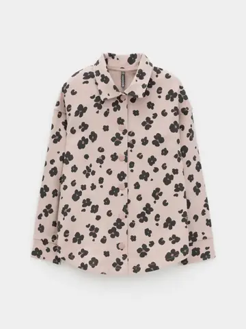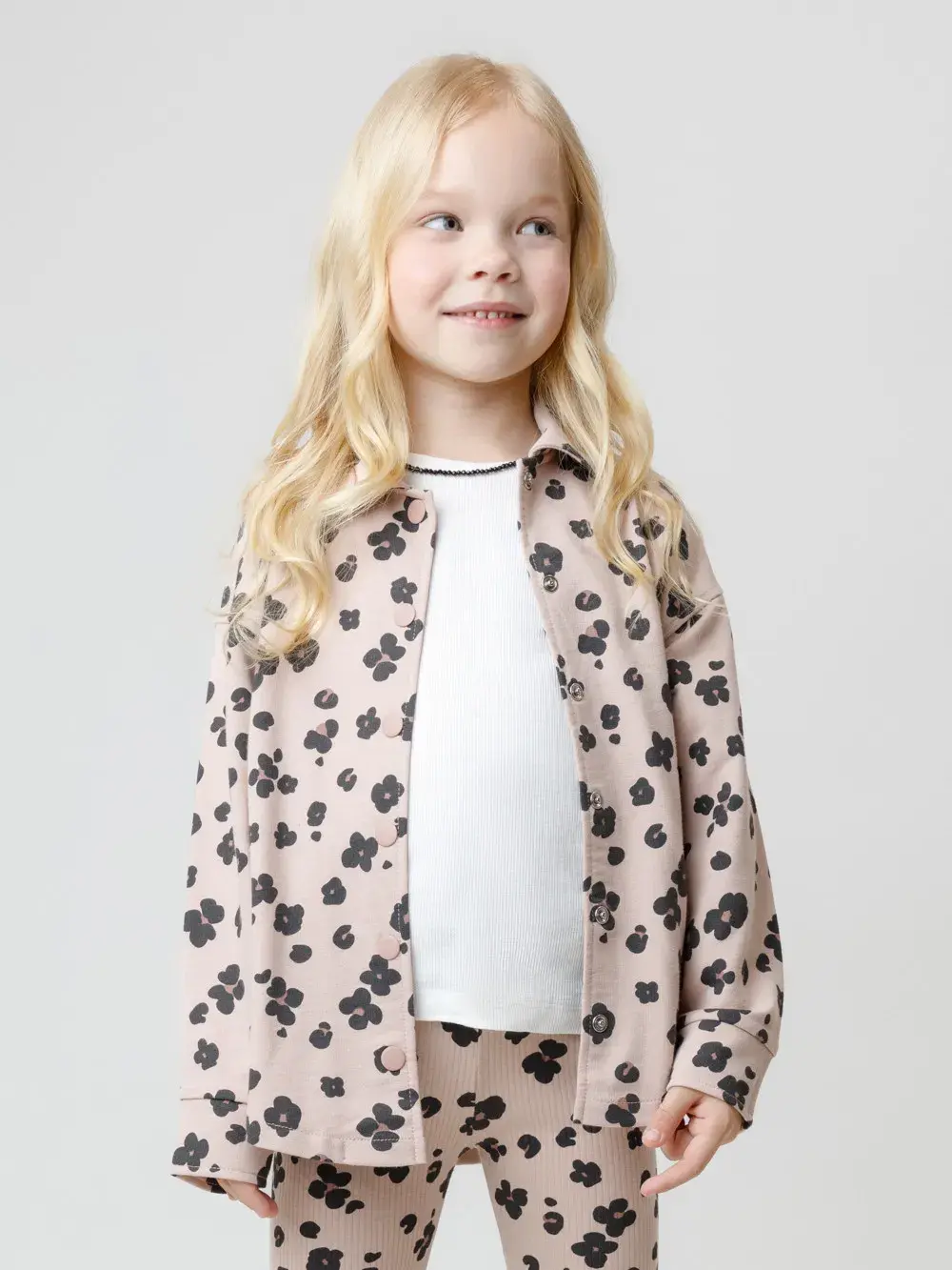 Свободная трикотажная рубашка для девочки из мягкого петельчатого футера. Застёгивается на кнопки. Модель с закругленным низом и спущенным плечом. Рисунок выполнен из стойких текстильных гипоаллергенных красителей. Изделие сохраняет цвет и форму после многократных стирок. Все трикотажные полотна производятся в соответствии с нормами швейцарского сертификата ЭкоТекс.