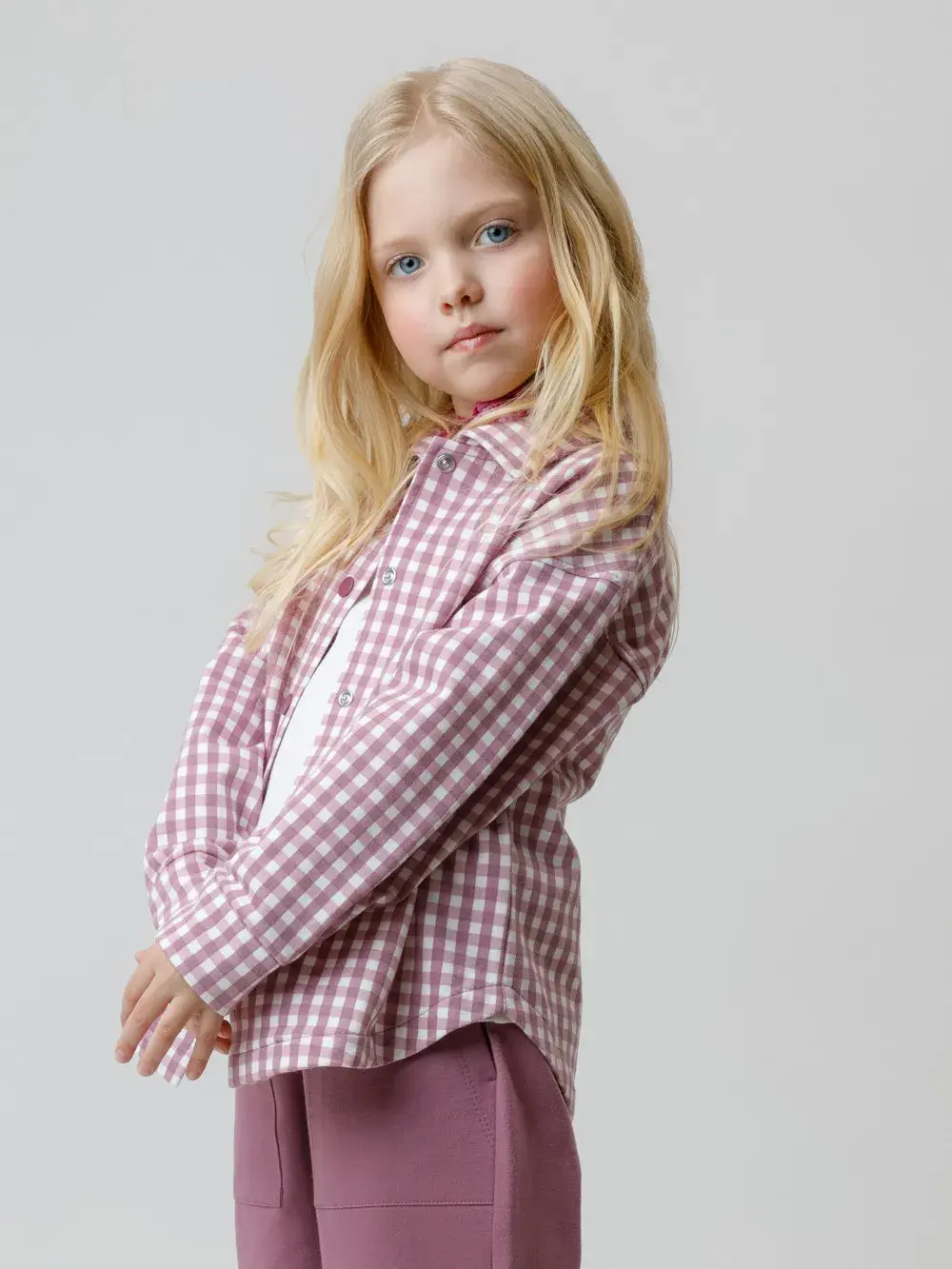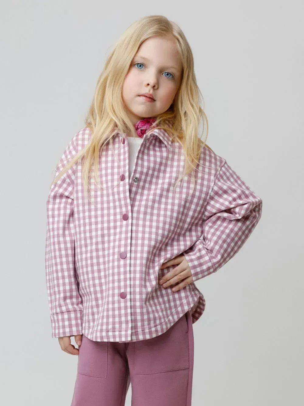 Свободная трикотажная рубашка для девочки из мягкого петельчатого футера. Застёгивается на кнопки. Модель с закругленным низом и спущенным плечом. Рисунок в клетку выполнен из стойких текстильных гипоаллергенных красителей. Изделие сохраняет цвет и форму после многократных стирок. Все трикотажные полотна производятся в соответствии с нормами швейцарского сертификата ЭкоТекс.