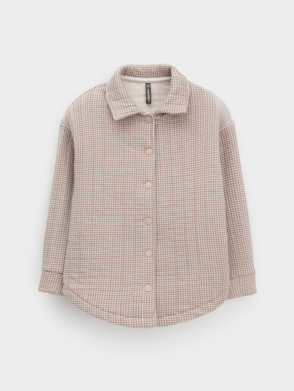 Тёплая рубашка свободного кроя для девочки из мягкого капитония. Капитоний – это стёганое трикотажное полотно с утеплителем из полиэстеровой нити. Модель с закругленным низом и спущенным плечом. Застёгивается на пуговицы. Рисунок в гусиную лапку выполнен из стойких текстильных гипоаллергенных красителей. Все трикотажные полотна производятся в соответствии с нормами швейцарского сертификата ЭкоТекс.