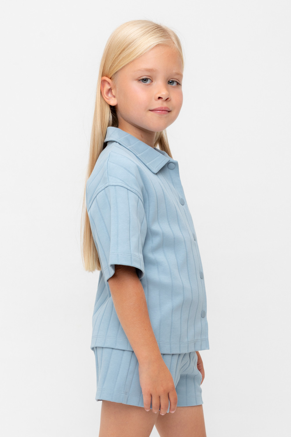 Рубашка для девочки из мягкого высококачественного трикотажа интерлок. Застёгивается на кнопки. Модель со спущенным плечом.
