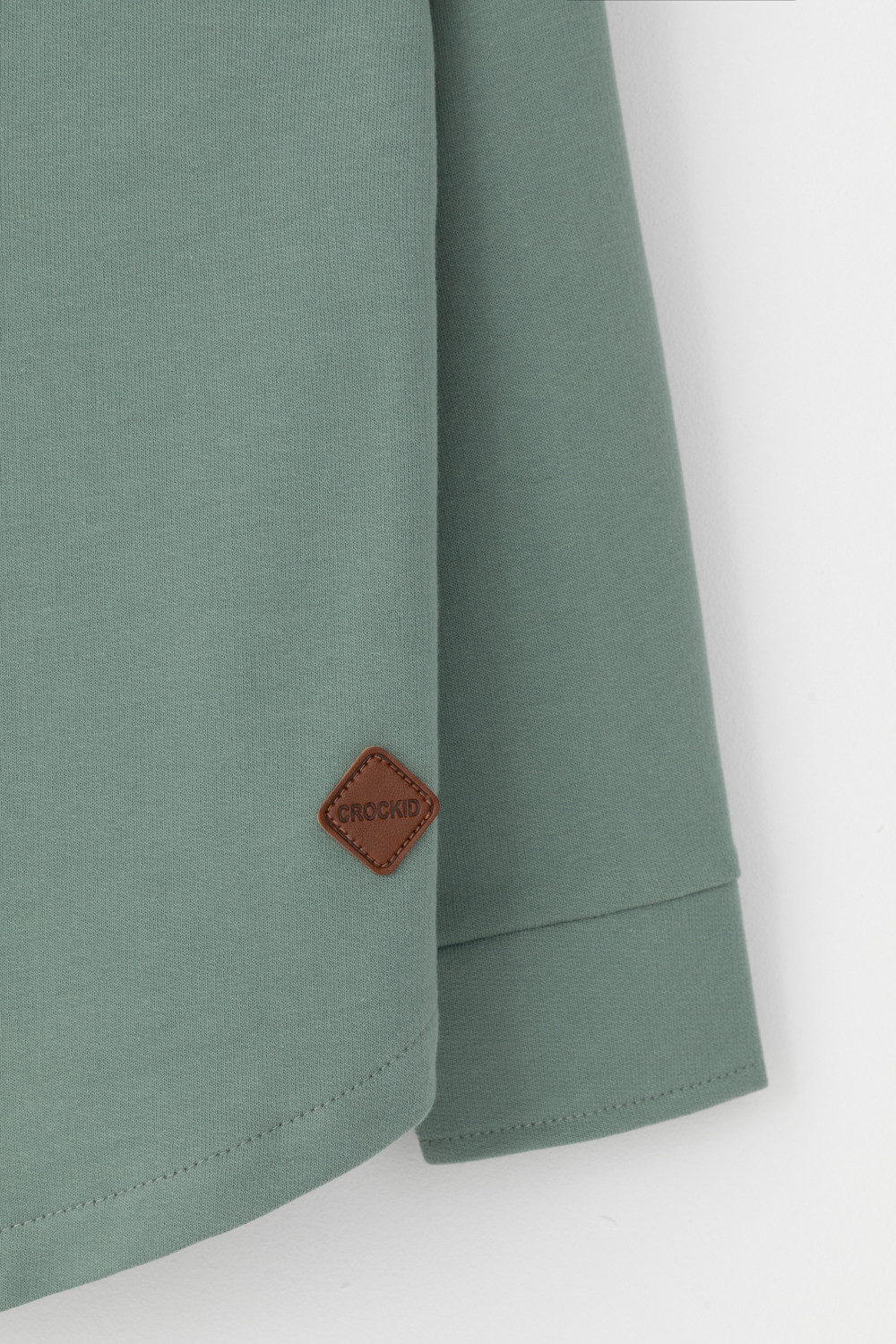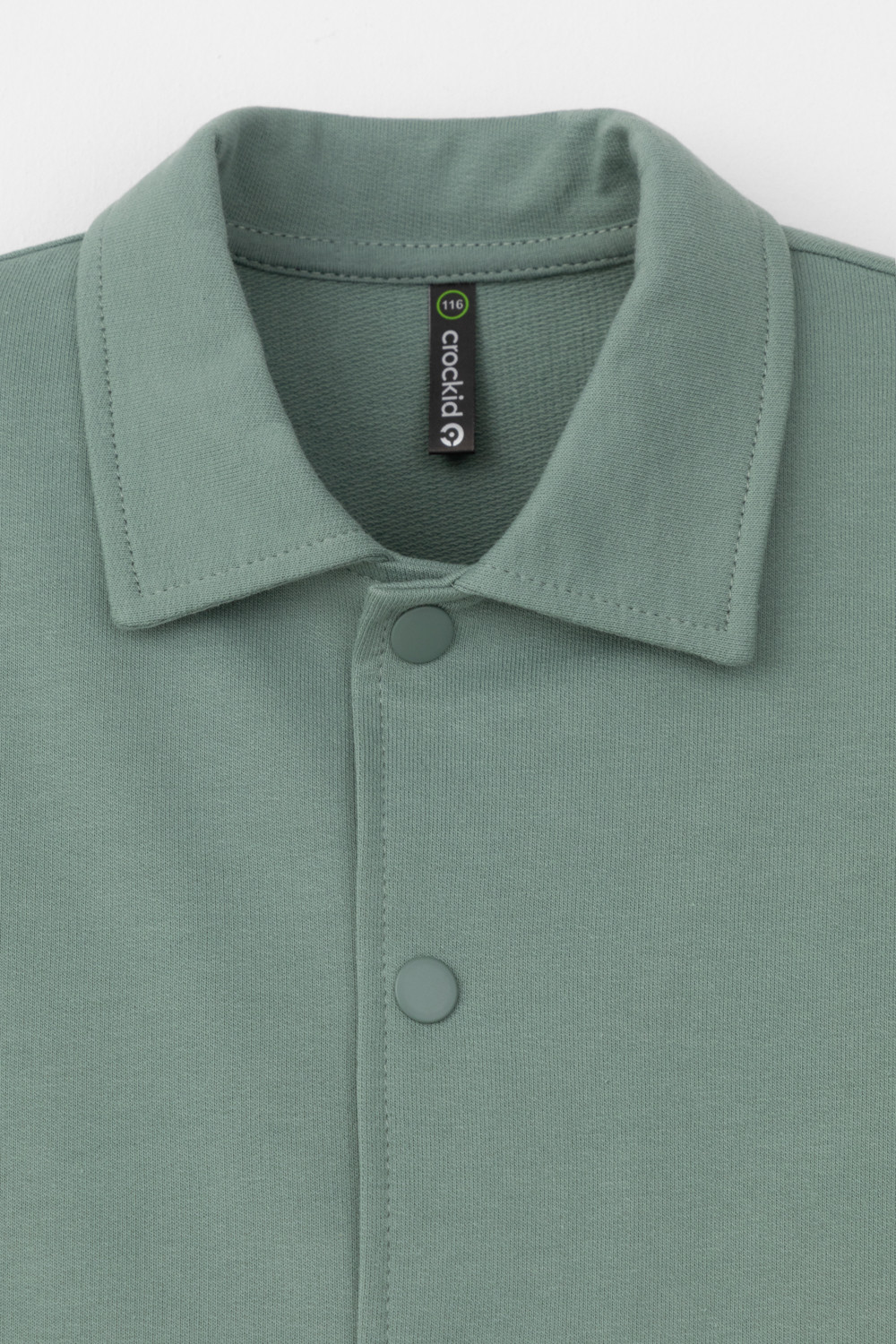 Свободная трикотажная рубашка для мальчика из мягкого петельчатого футера. Застёгивается на кнопки. Модель с закругленным низом и спущенным плечом.