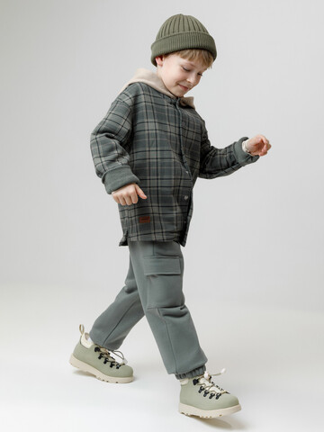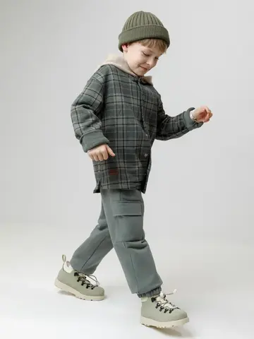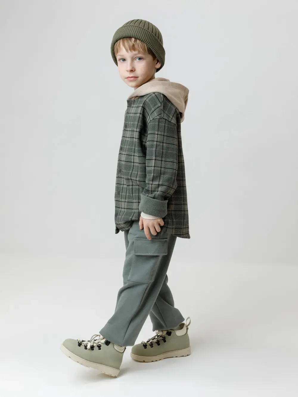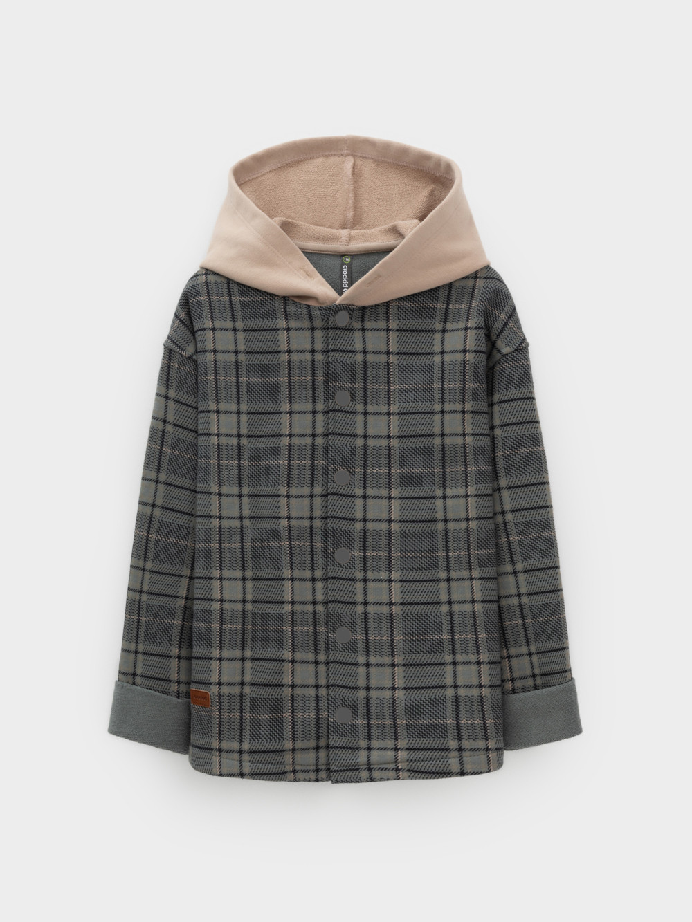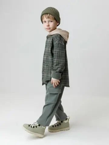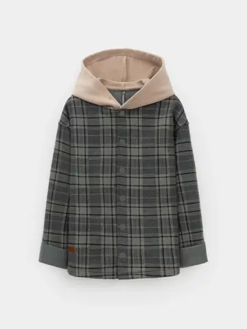 Свободная трикотажная рубашка с капюшоном для мальчика из мягкого петельчатого футера трёхнитки. В составе 80% натурального хлопка и 20% полиэстера, при этом полиэстер ввязан внутрь по особой технологии и не соприкасается с кожей. Застёгивается на кнопки. Рисунок в клетку выполнен из стойких текстильных гипоаллергенных красителей. Изделие сохраняет цвет и форму после многократных стирок. Все трикотажные полотна производятся в соответствии с нормами швейцарского сертификата ЭкоТекс.