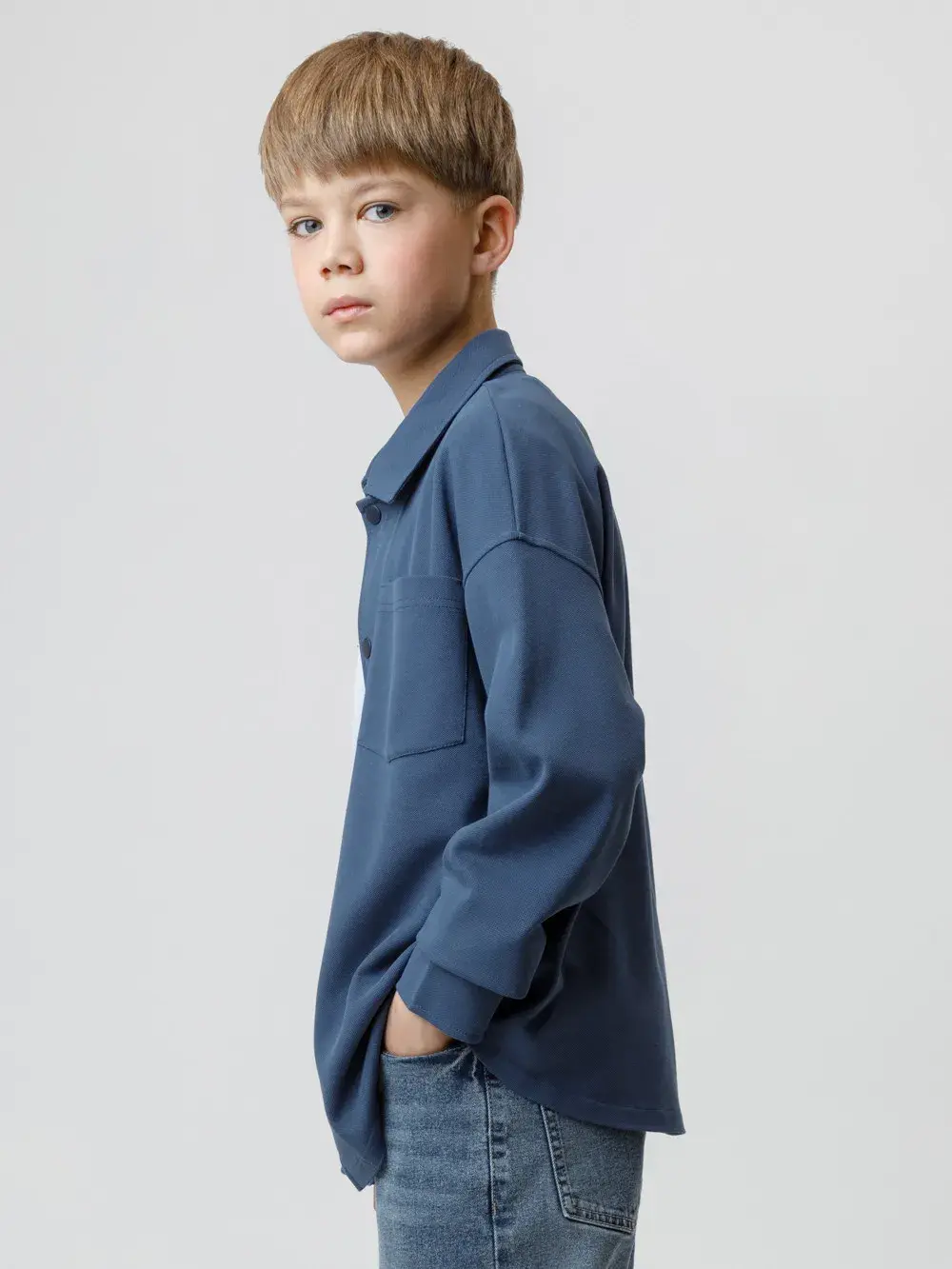 Свободная трикотажная рубашка для мальчика из мягкого трикотажа пике. Застёгивается на кнопки. Модель с закругленным низом и спущенным плечом. Все трикотажные полотна производятся в соответствии с нормами швейцарского сертификата ЭкоТекс.