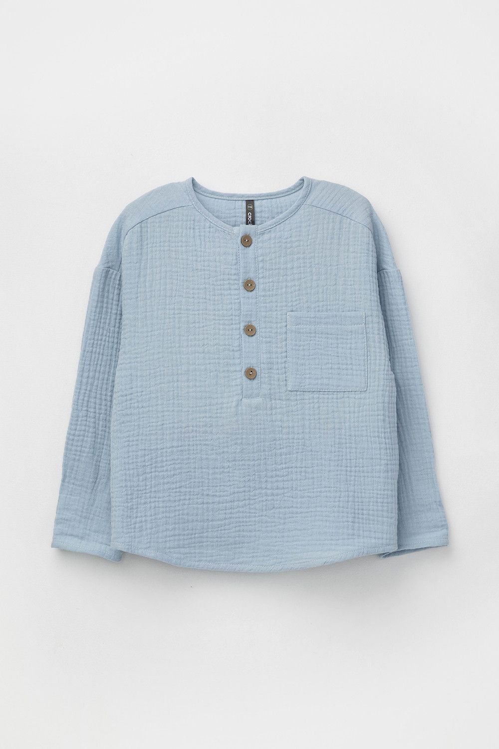 Легкая детская рубашка свободного кроя из мягкого хлопокового муслина, слегка спущенной линией плеча, длинными рукавами и с застежкой на пуговицы. Изделие сохраняет цвет, форму и фактуру жатости после многократных стирок.