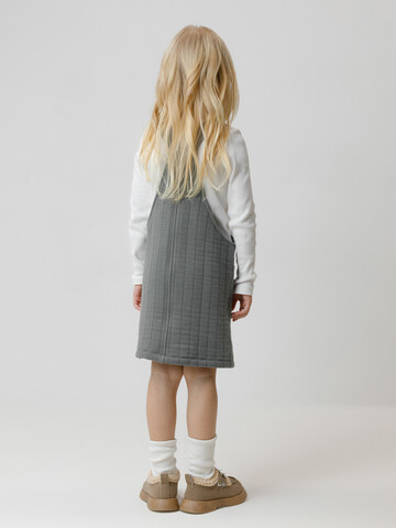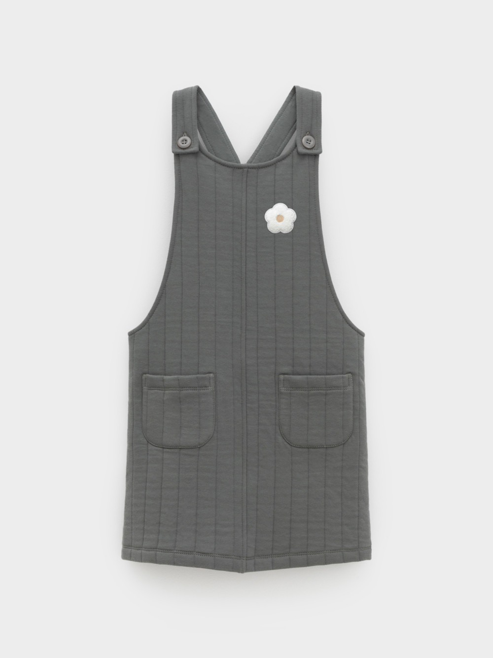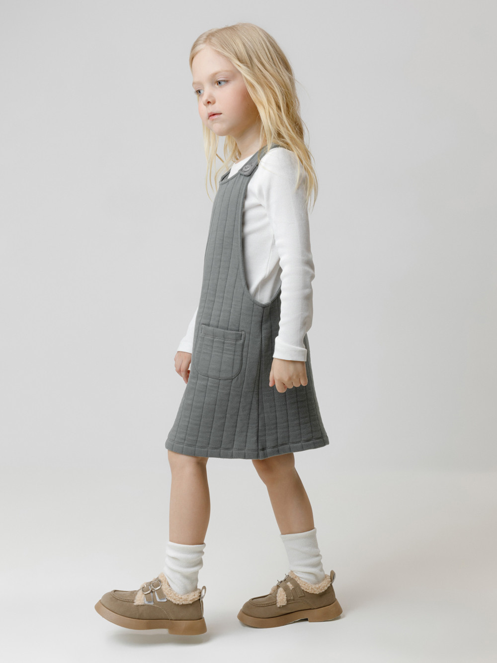Сарафан на лямках из капитония с двумя накладными карманами. Капитоний – это стёганое трикотажное полотно с утеплителем из полиэстеровой нити. Лямки застегиваются на пуговицы. Все трикотажные полотна производятся в соответствии с нормами швейцарского сертификата ЭкоТекс.