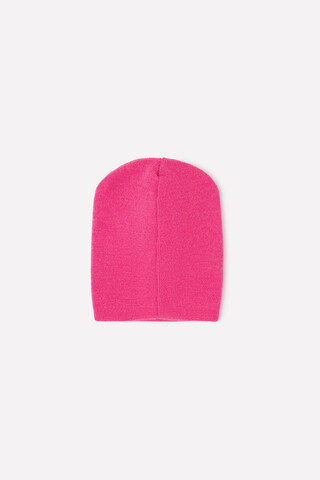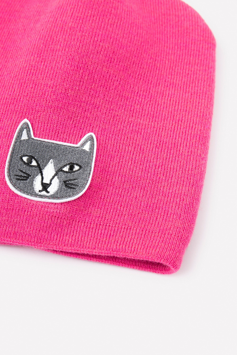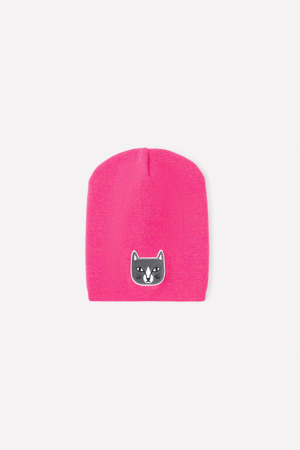 Двойная розовая шапка из полушерсти. Украшена нашивкой с изображением котика.
