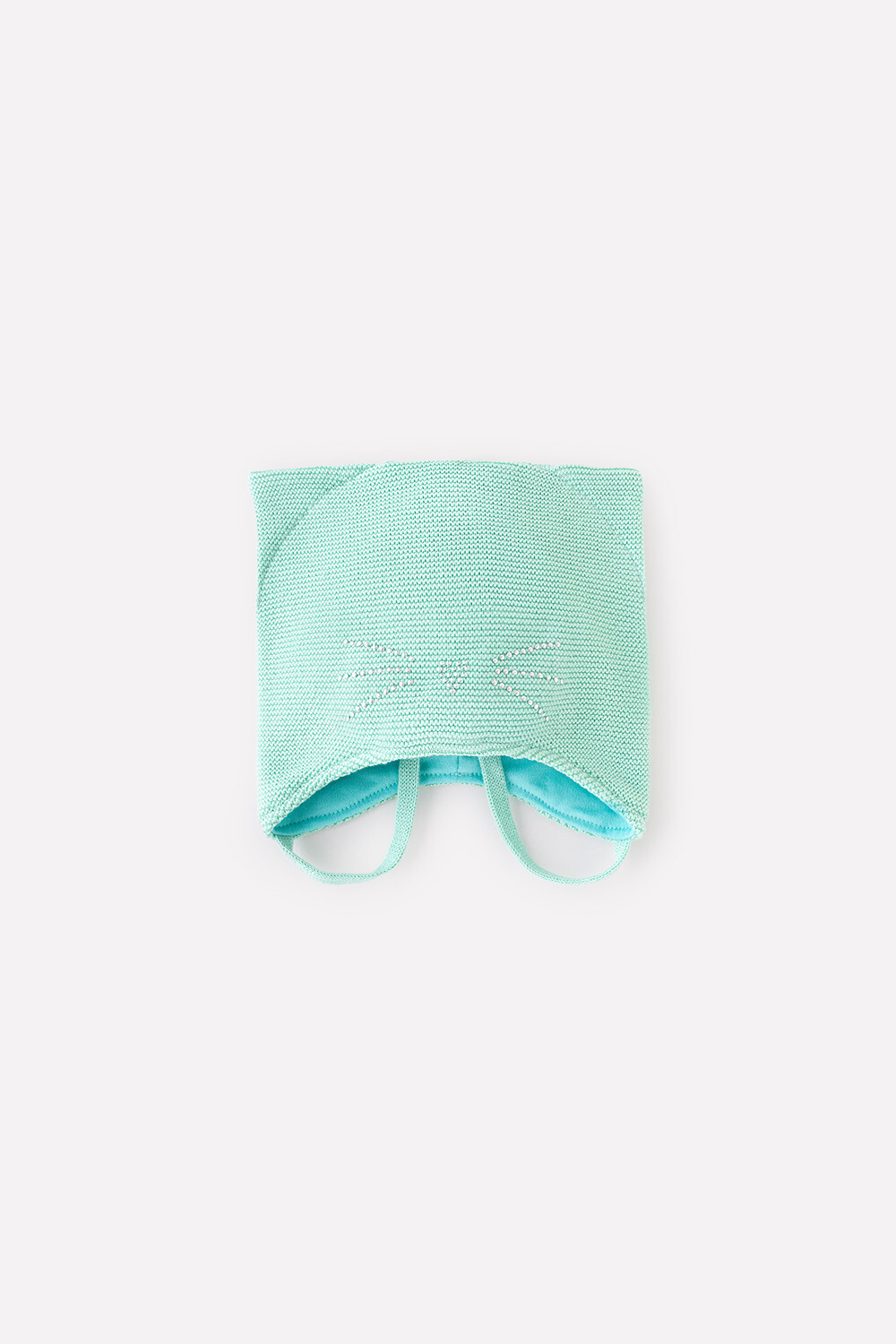 Шапка из акриловой пряжи. Украшена стразами в виде мордочки и ушками котёнка. Внутри мягкий трикотажный подклад из интерлока. Завязывается под подбородком.