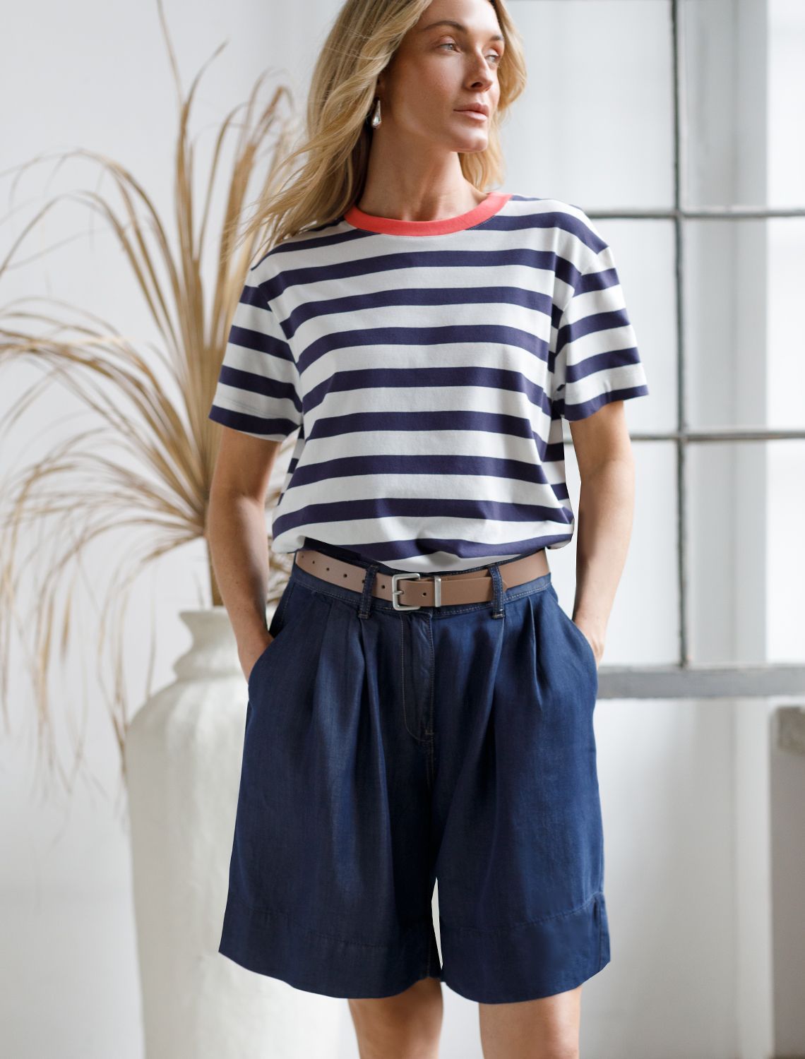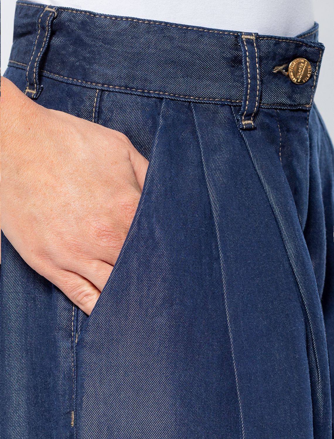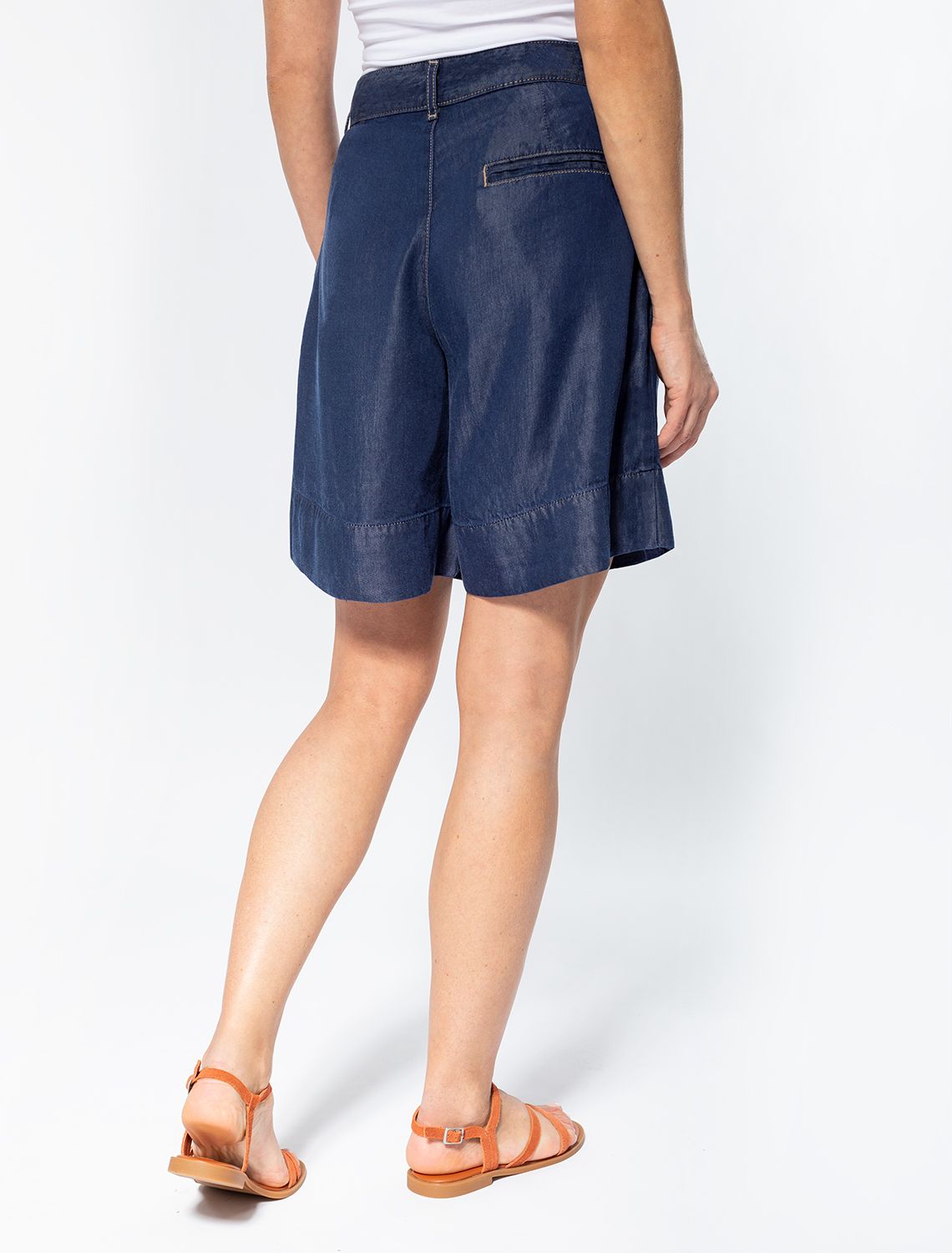Шорты "бермуды" выполнены из струящегося 100% лиоцелла. Деним из такого материала обладает особой мягкостью и прочностью. Имеет полуматовый блеск, как у натурального шелка. Отлично холодит кожу в жаркое время года, сохраняя комфортный микроклимат. Глубокий синий цвет без стирки дополнен золотистой фурнитурой в стиле old-money. Сочетается в костюме с жакетом D51.030