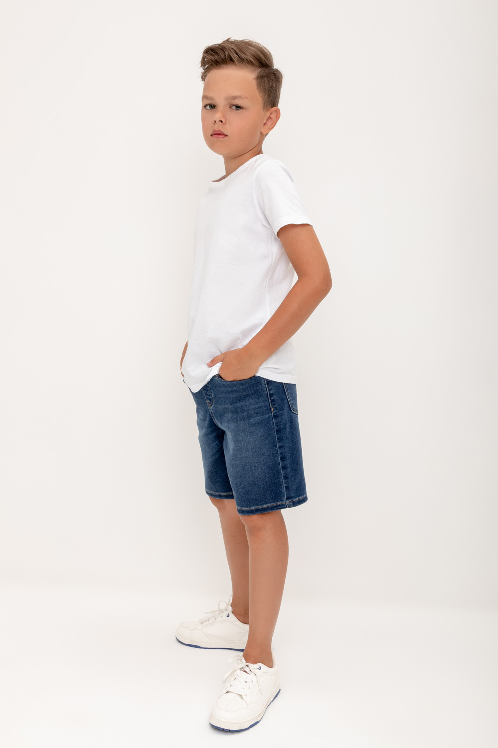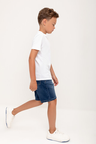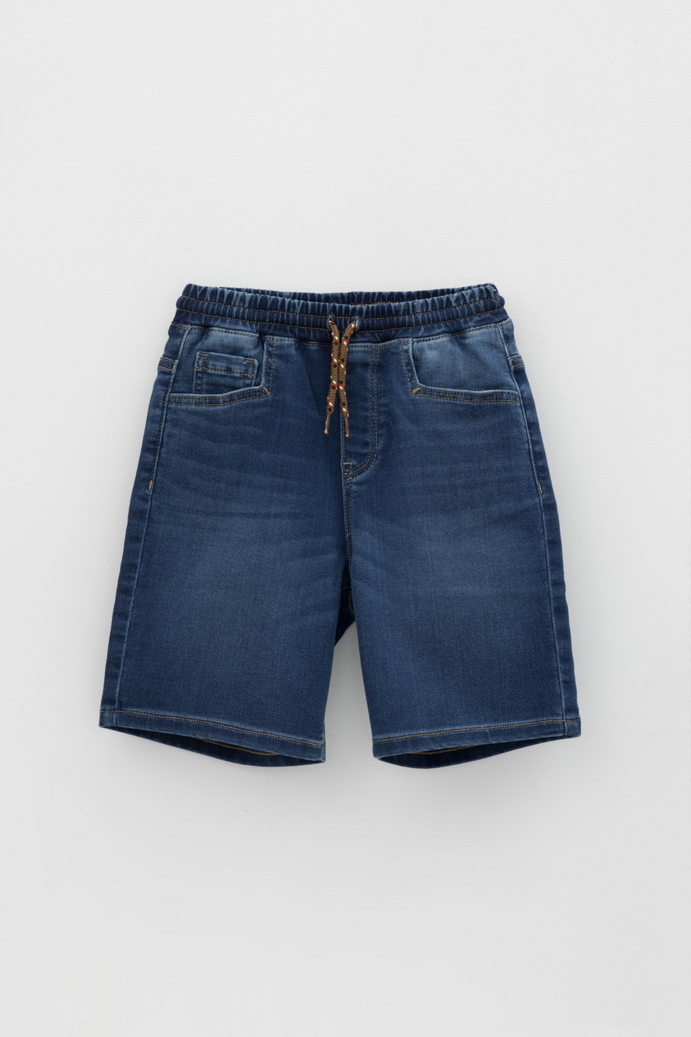 Джинсовые шорты для мальчика с потертостями на резинке со шнурком. По бокам и сзади карманы. На поясе нашивка из эко кожи.