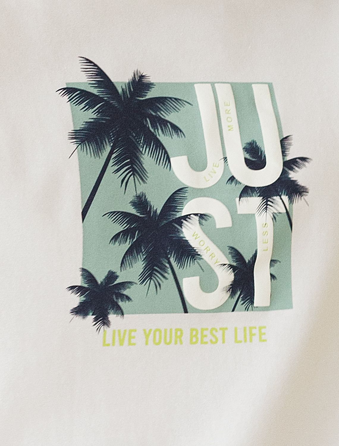 Перевод принта: Live your best live - живи свою лучшую жизнь. Футболка свободного кроя выполнена из премиального хлопка. Авторский принт нанесен красками с устойчивым покрытием. Благодаря эластану, носить изделие очень комфортно, и оно сохранит свой безупречный вид в течение долгого времени. На рукаве нашивка из эко-кожи с логотипом бренда.