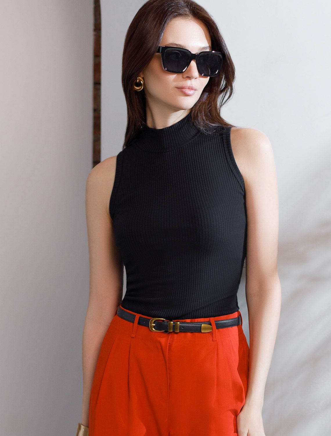 Топ с воротом стойкой выполнен из трикотажа в широкий рубчик. Премиальное качество хлопковых волокон и наличие эластана в составе изделия способствуют идеальной посадке по фигуре не сковывая движений. Изделие сохранит свой безупречный внешний вид в течении долгого времени. Модель хорошо сочетается в многослойных осенних образах, с жакетами и кардиганами.