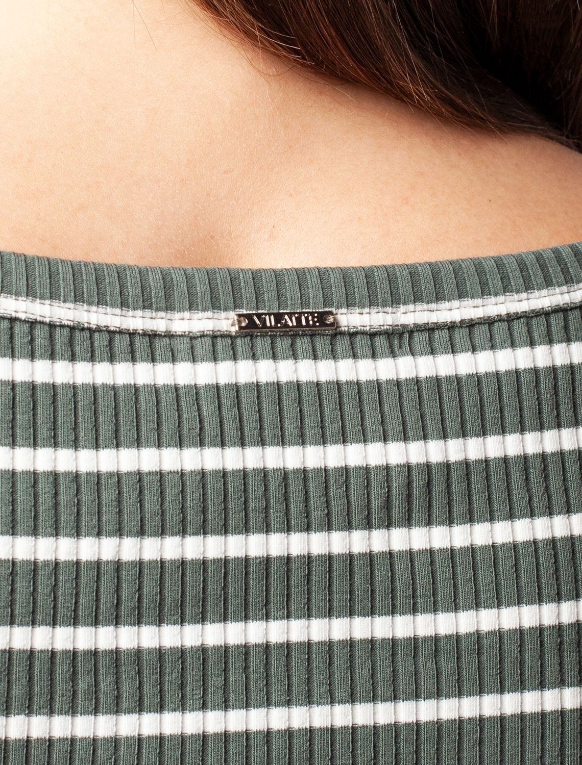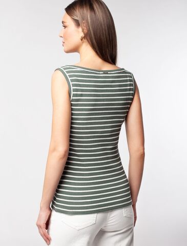 Топ выполнен из трикотажа в широкий рубчик. Премиальное качество хлопковых волокон и наличие эластана в составе изделия, обеспечивают абсолютный комфорт, не сковывая движений. Изделие обладает хорошей формоустойчивостью и надолго сохранит свой безупречный внешний вид. Металлический логотип бренда.