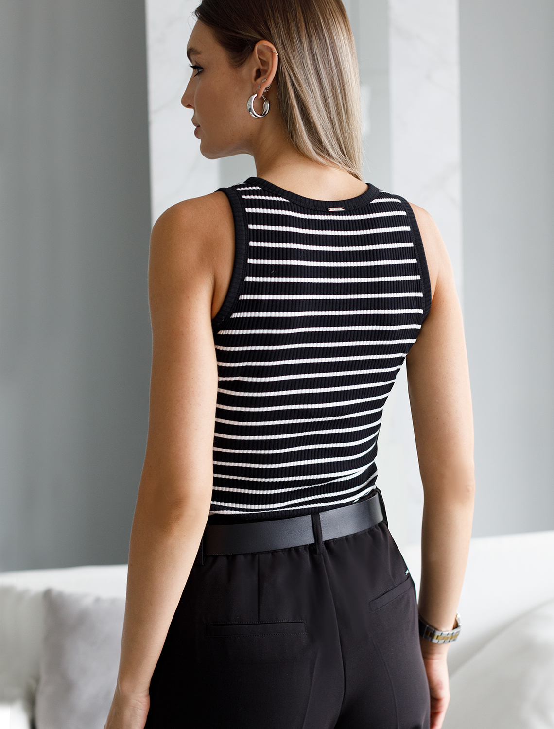 Топ выполнен из трикотажа в широкий рубчик. Премиальное качество хлопковых волокон и наличие эластана в составе изделия, обеспечивают абсолютный комфорт, не сковывая движений. Изделие обладает хорошей формоустойчивостью и надолго сохранит свой безупречный внешний вид. Металлический логотип бренда.