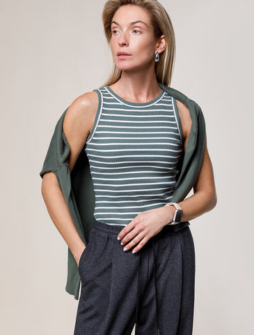 Топ выполнен из трикотажа в широкий рубчик. Премиальное качество хлопковых волокон и наличие эластана в составе изделия, обеспечивают абсолютный комфорт, не сковывая движений. Изделие обладает хорошей формоустойчивостью и надолго сохранит свой безупречный внешний вид. Металлический логотип бренда.