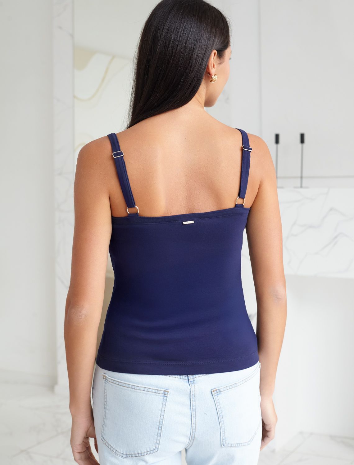 Стильный и базовый топ темно-синего цвета полуприлегающего кроя идеально подходит для девушек и женщин всех возрастов. Двуслойная зона бра. Линия декольте образована посредством сгиба полотна без отсрочки и закреплением обоих слоев в шве проймы. Удобные регулируемые бретели. Прямой силуэт подходит любому типу фигуры. Квадратный вырез горловины - тренд этого сезона. Он выполнен из качественной дышащей ткани, что обеспечивает комфорт в жаркую погоду. Однотонный дизайн позволяет легко сочетать его с различными предметами гардероба, создавая элегантный повседневный образ.