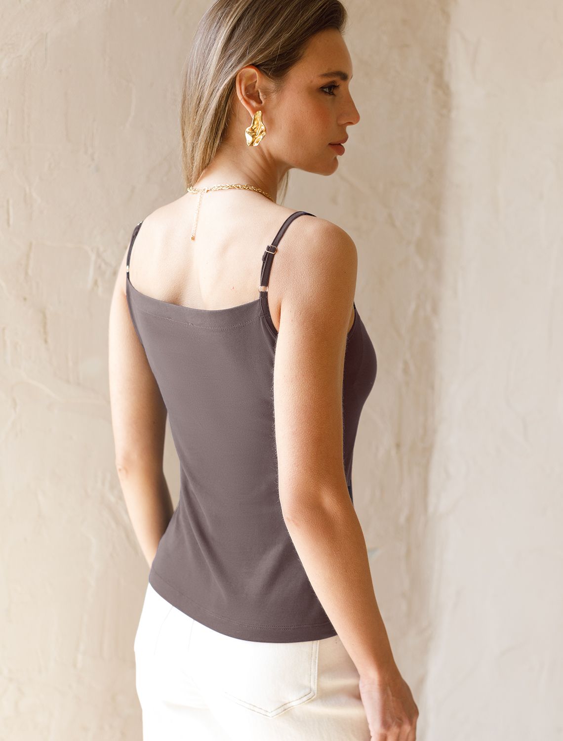 Базовый топ с V-вырезом облегающего кроя кофейного цвета в выполнен из премиального хлопка. Ткань приятна на ощупь, имеет отличную воздухопроницаемость, что обеспечивает комфорт в жаркую погоду, в тоже время не просвечивает, выглядит дорого. Открытое декольте и аккуратные тонкие регулируемые бретели деликатно подчеркнут изящную шею и плечи. За счет эластана в составе повседневный топ подойдет на любую женскую фигуру, держит форму и сохранят свой перевоначальный вид при длительном ношении. Представлена широкая размерная линейка, маленькие и большие размеры. С этим топом легко создать элегантный повседневный образ девушкам и женщинам любого возраста. Майка идеально подойдет как для работы, так и для деловых встреч, добавляя нотку женственности в любой наряд, можно носить как самостоятельную вещь, без верхнего слоя.