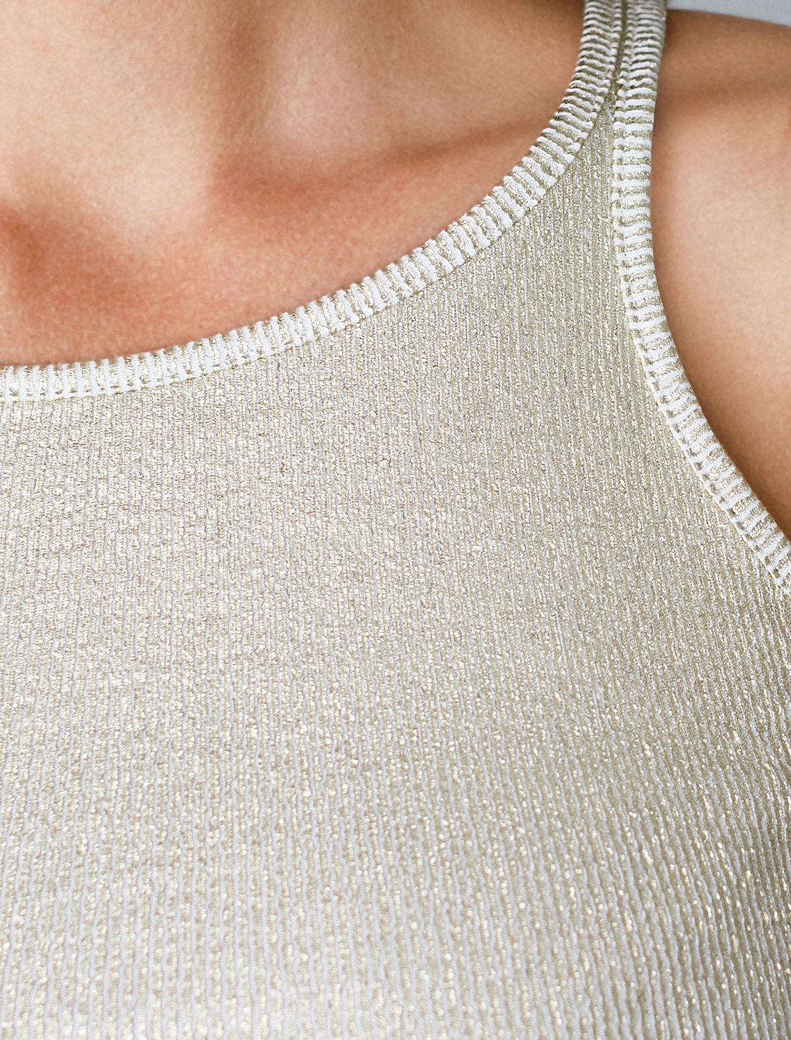 Эффектный топ золотистого цвета из мягкого хлопка с эластаном представлен в стильном исполнении с матовым покрытием металлик. Мелкий рубчик визуально вытягивает силуэт и подчеркивает фигуру, делая образ более стройным и аккуратным. Круглый ворот и суженные лямки акцентируют внимание на линии ключиц, делая образ утонченным и изысканным, Благодаря деликатному блеску топ подходит для тех, кто ценит утонченность и стремится добавить в образ немного сияния без перебора - это отличный вариант топа для любительниц минимализма.