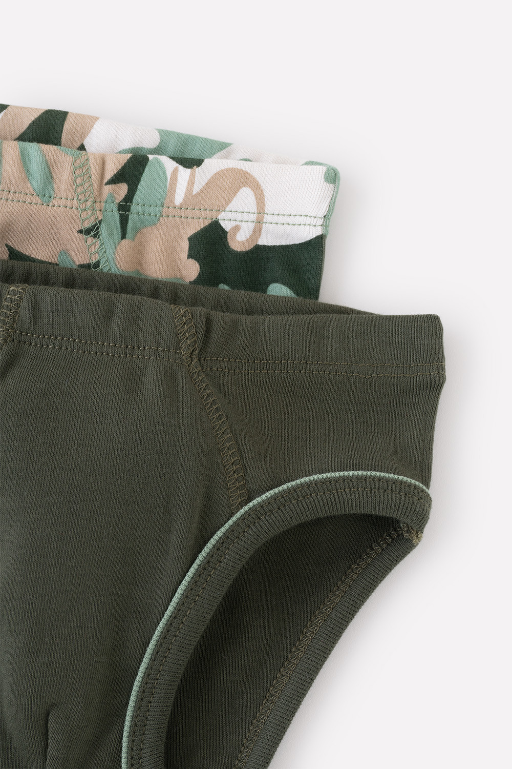 Комплект трусов для мальчика. Сшиты из эластичного материала рибана пенье. В упаковке 3 штуки: зелёный хаки + тропический камуфляж. Проймы обработаны бейкой.